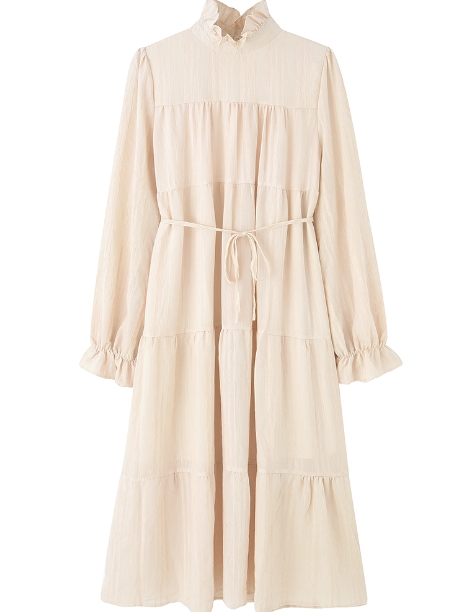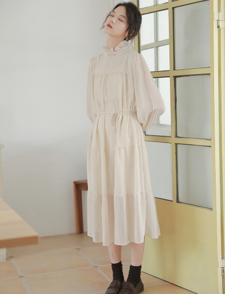 ワンピース ワンピドレス 膝下 ロング ロング丈 袖あり 長袖 ハイネック 襟なし Aライン リボン ウエストリボン 透け感 綿 薄手 かわいい 大人可愛い きれいめ シンプル カジュアル 大人 アジアン エスニック 大人女子 ラフ キュート 抜け感 無地 春 秋 誕生日 10代 20代