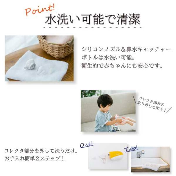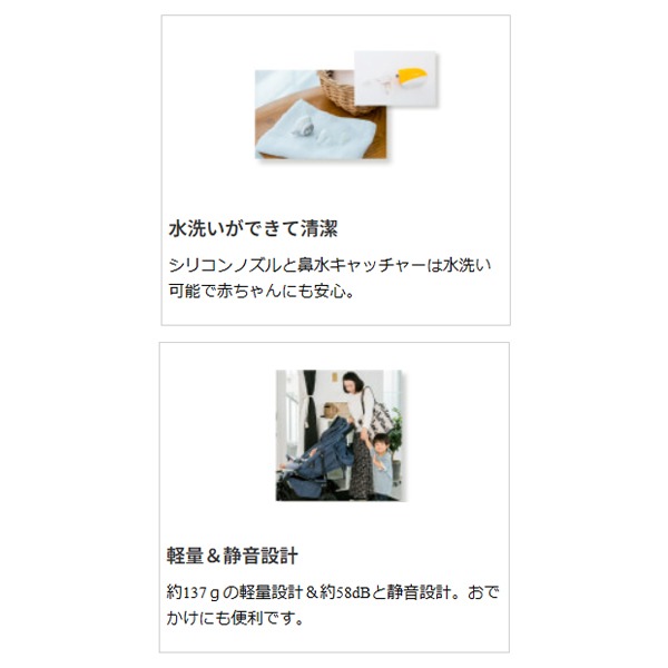 | 鼻を傷つけにくいシリコン製! 鼻水の状態に合わせて選べる 2種類の吸引力! | |