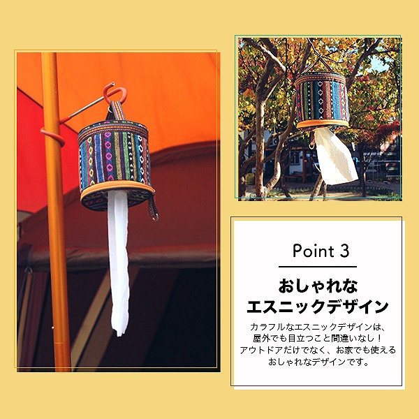 | 商品の説明 | アウトドアに最適!トイレットペーパーカバー 置き場所に困るトイレットペーパーも専用カバーへ収納することで清潔に保てるうえ、とっても使いやすくなります。カバーには吊り下げ用のループが2つ付いており、お好きな場所に掛けることができます。キャンプ時のロープやランプハンガー、木の枝など、どんな場所へも設置・固定できるので、アウトドアでとても便利です。 おすすめポイント POINT1:2WAYスタイル 卓上・吊り下げ、どちらの使い方でもOK! 吊り下げ用のループが2つ付いているので、テントロープやポールポール、ランプ、木の枝などに簡単に設置、固定できます。 POINT2:取り出しやすい開口部 開口部は2.5cmのゆったりサイズ!さらにリングバックルで加工しているので、紙をなめらかに取り出せます。 POINT3:おしゃれなエスニックデザイン カラフルなエスニックデザインは、屋外でも目立つこと間違いなし! アウトドアだけでなく、お家でも使えるおしゃれなデザインです。 |