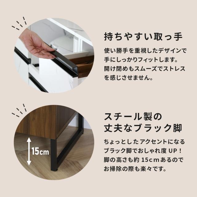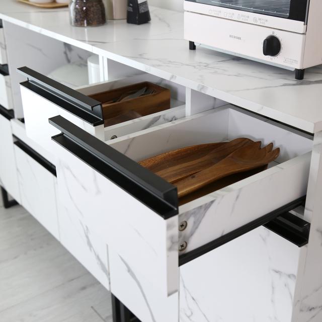 開閉がスムーズで取り出しやすい引き出しも備わっています。カトラリーやキッチンツールも手軽に取り出せ、効率的なキッチン作業をサポートします。