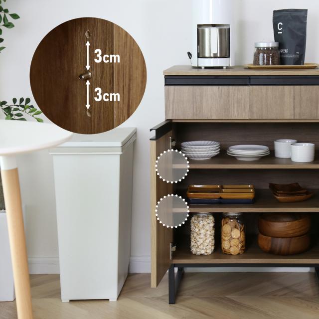 扉を開けると可動棚が2枚付いた収納スペースが完備されています。それぞれ3段階3cm間隔で高さが調整できるので、食器・調味料・背の高い瓶類など収納物に合わせて自由自在に調整することができ、使い勝手の良い収納を実現します。扉があるので生活感を隠せるのも嬉しいポイント!