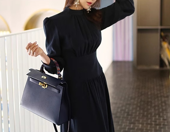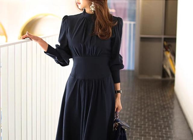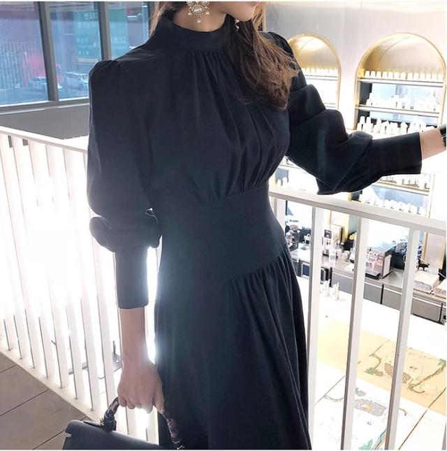 プチハイネック プリーツ 切り替え ワンピ ワンピース ロング ロング丈 長袖 パフスリーブ ハイネック 襟なし フレア ウエストマーク 切り替えデザイン ハイウエスト かわいい 大人可愛い きれいめ シンプル 大人 上品 おしゃれ 大人女子 こなれ感 クール モード系 エレガント