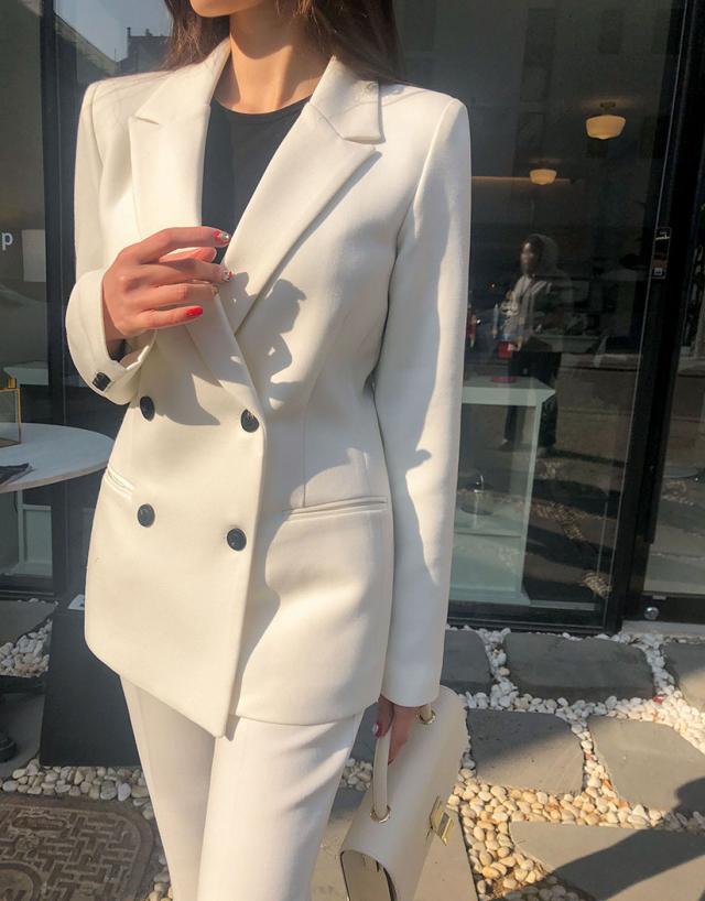 程よいトレンド感のあるダブルブレストジャケットに、ベーシックなテーパードパンツのセットアップ。