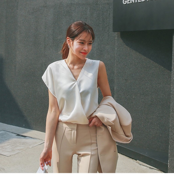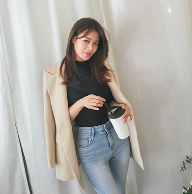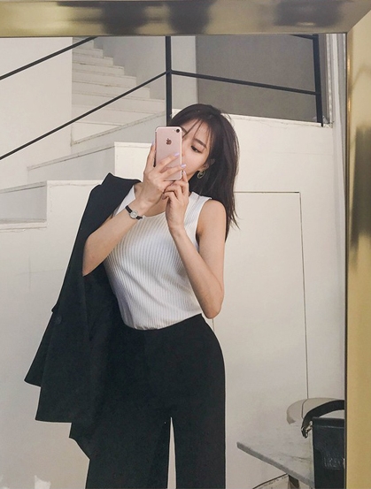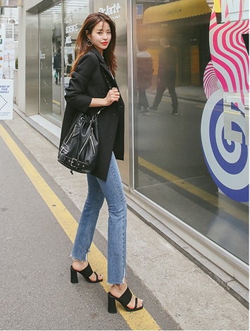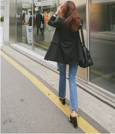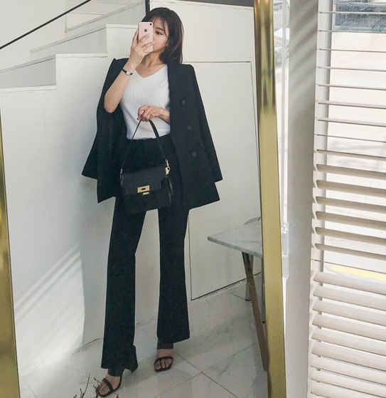 ハイウエスト切替えのジャケットに、フレアパンツが程よい抜け感を作りだし洗練されたスタイルに。