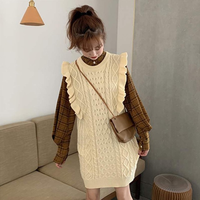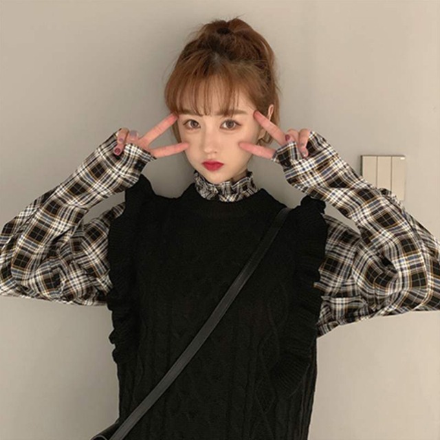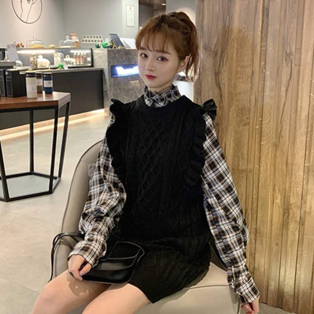 セットアップ ツーピース 2点セット ニットセーターベスト チェック柄シャツ 袖あり 長袖 ラウンドネック 襟なし フリル ポケット 前開き 上下セット きれいめ シンプル カジュアル おしゃれ お洒落 かっこいい 大人女子 クール 楽ちん 無地 柄 春 秋 冬 10代 20代 30代 40代