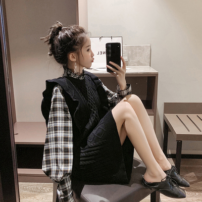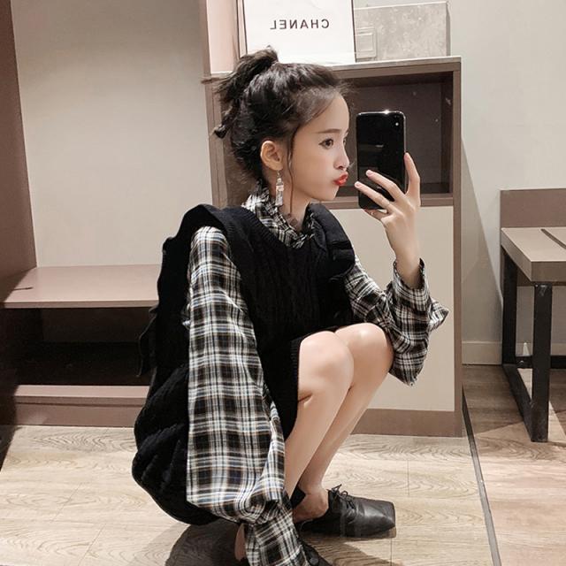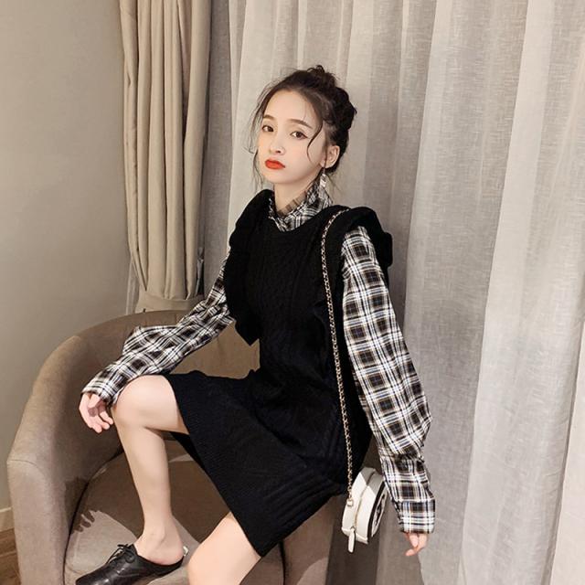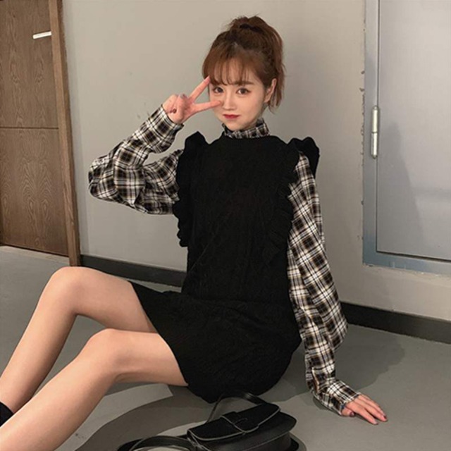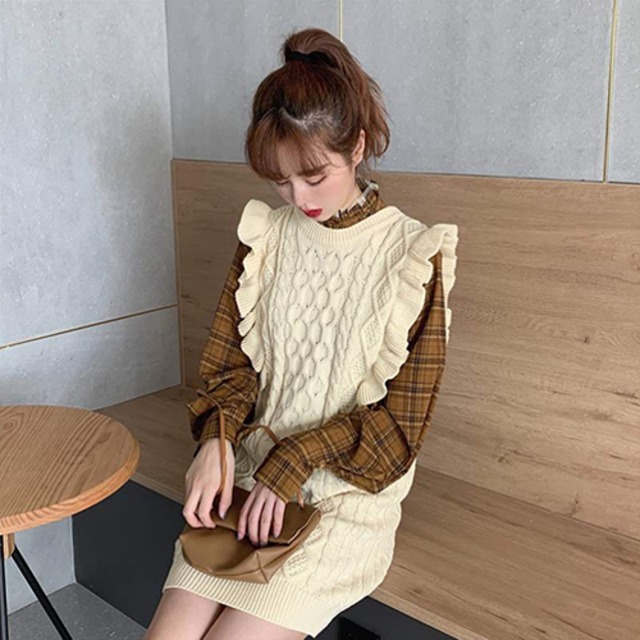 ニットベストとチェック柄シャツがセットになったツーピース。