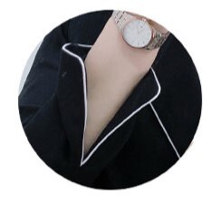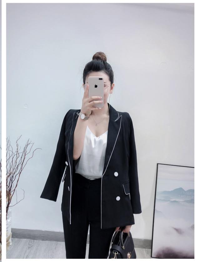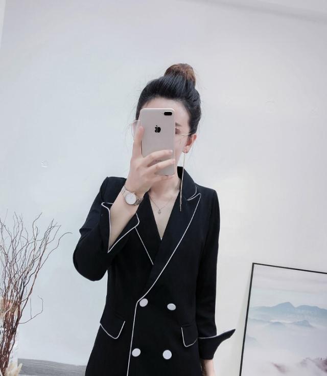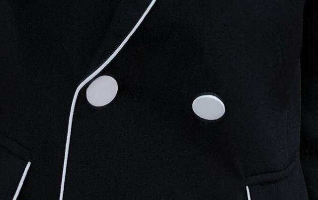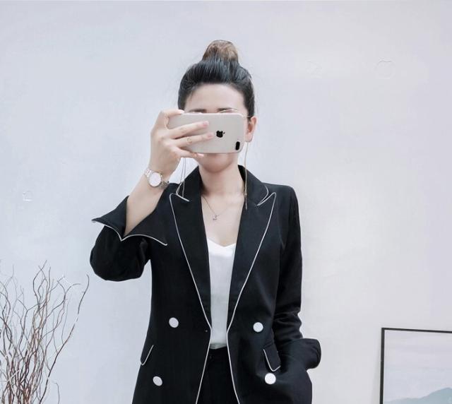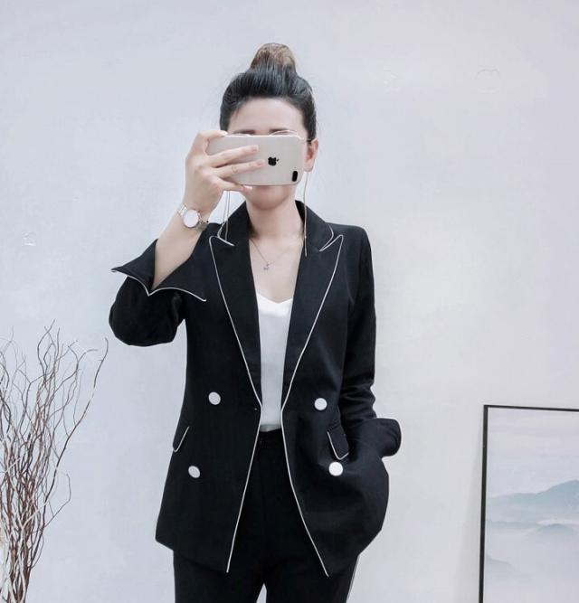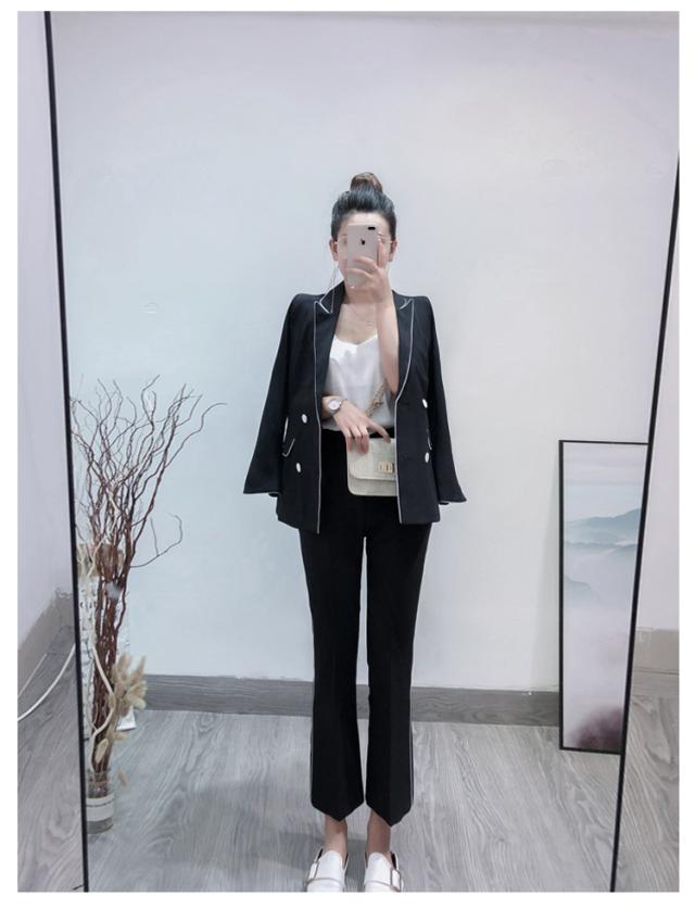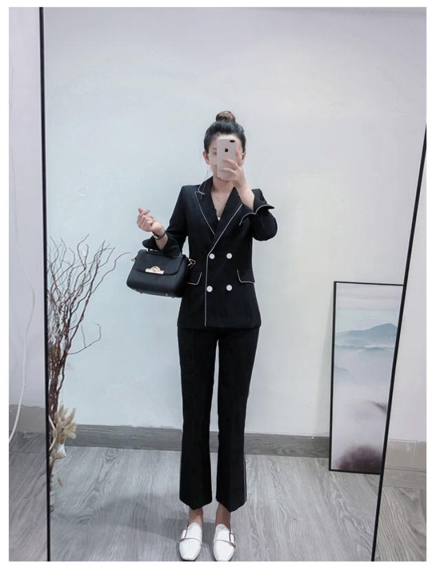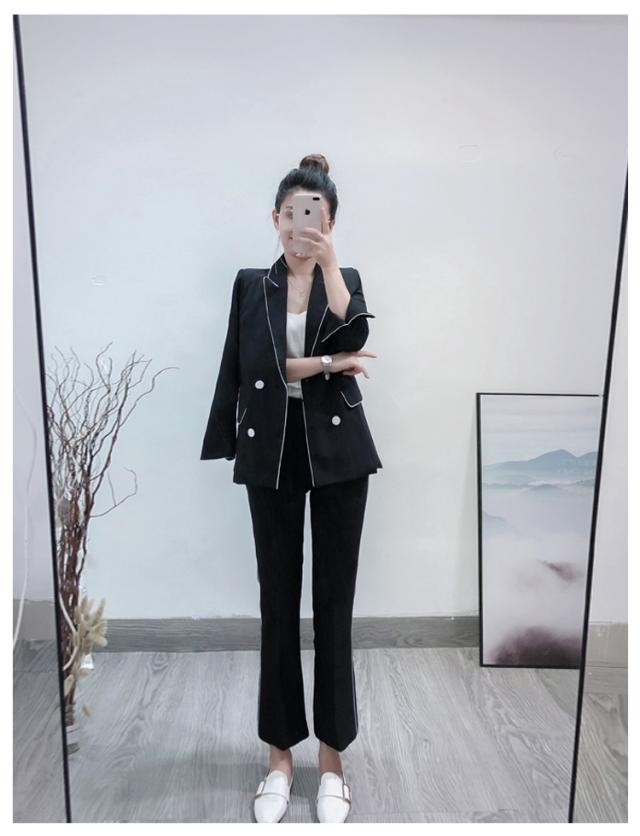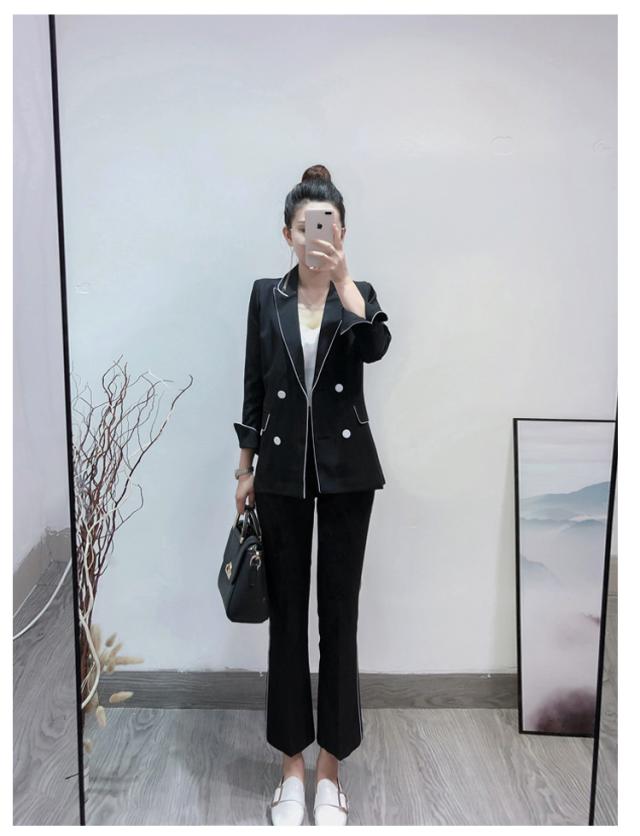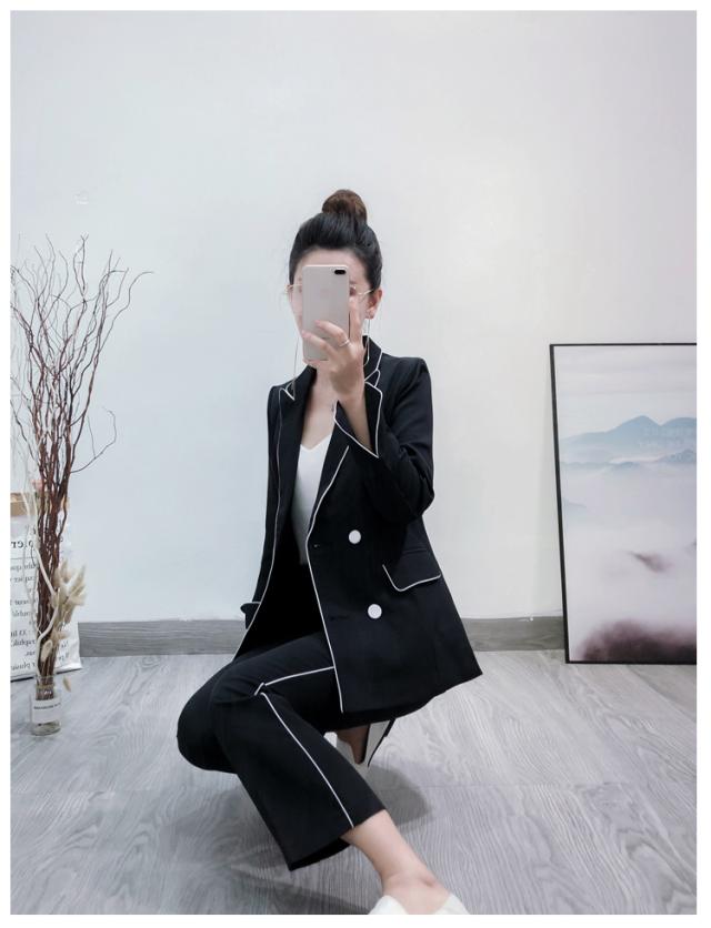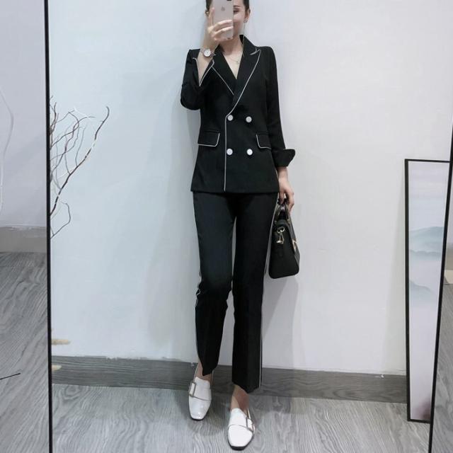 大人可愛い、おしゃれで上品な白いラインが入ったツーピースセットのスーツ。