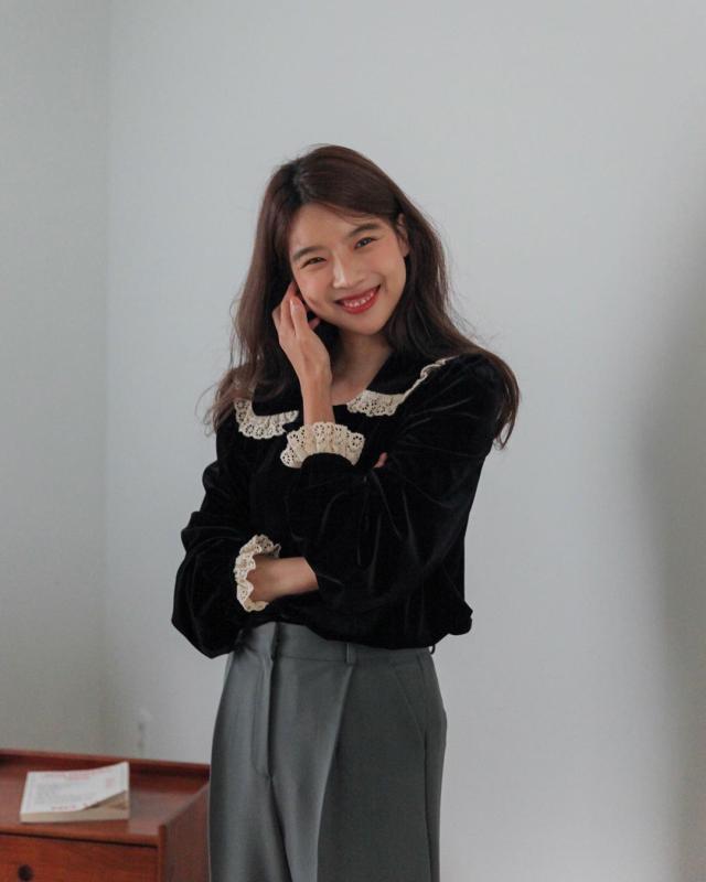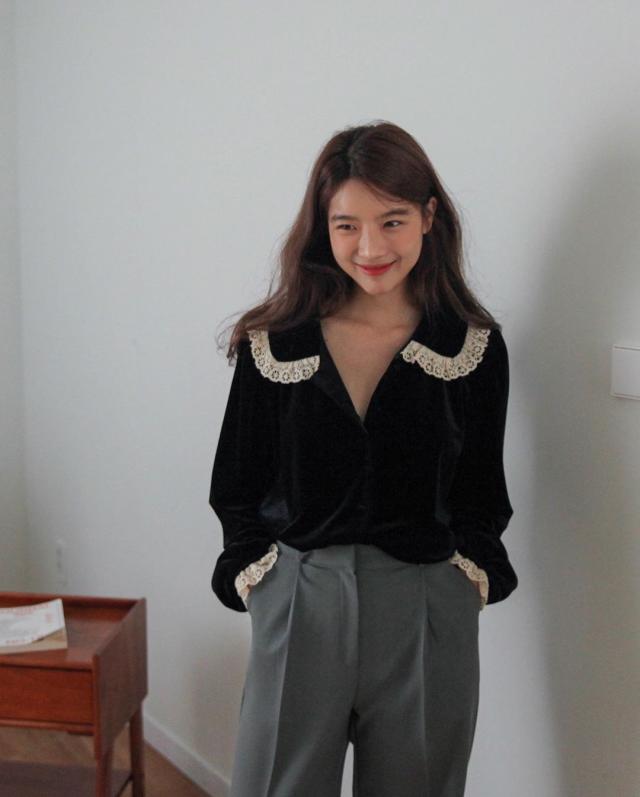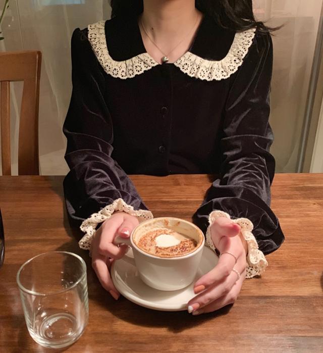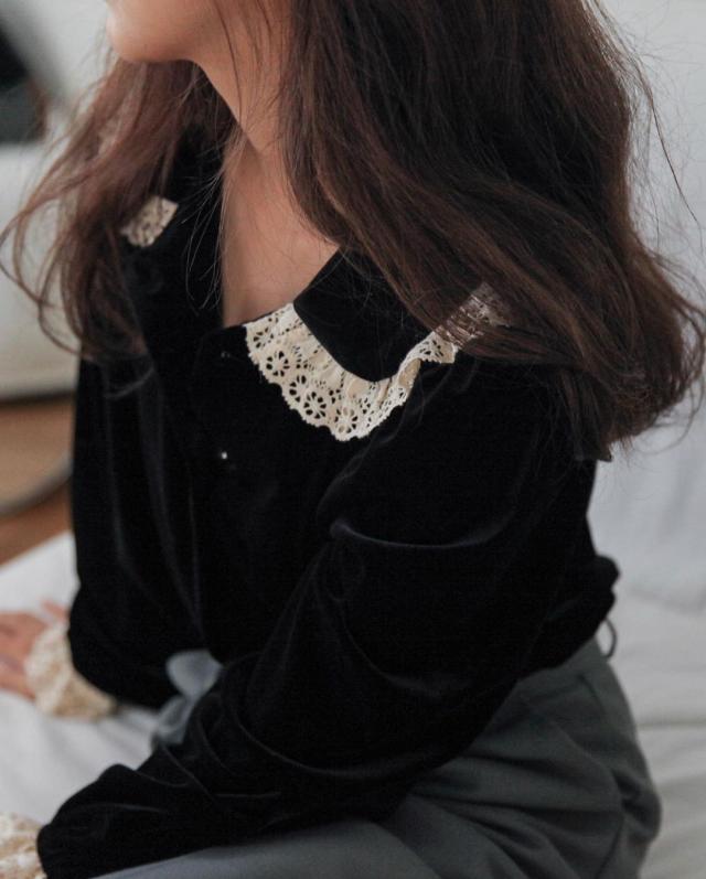 レース襟とレース袖のデザインがフェミニンなムードを演出するブラウス。