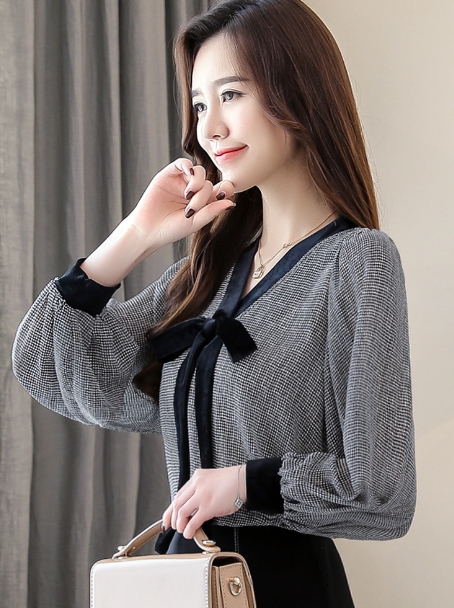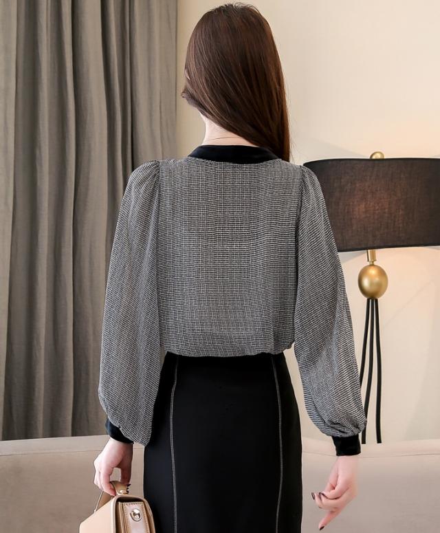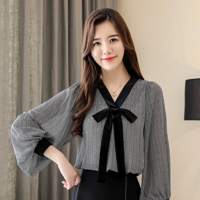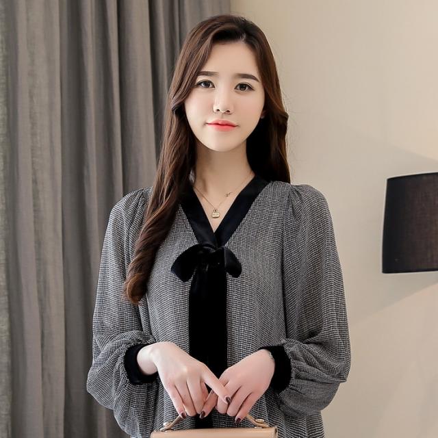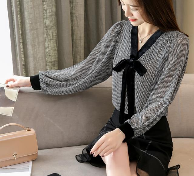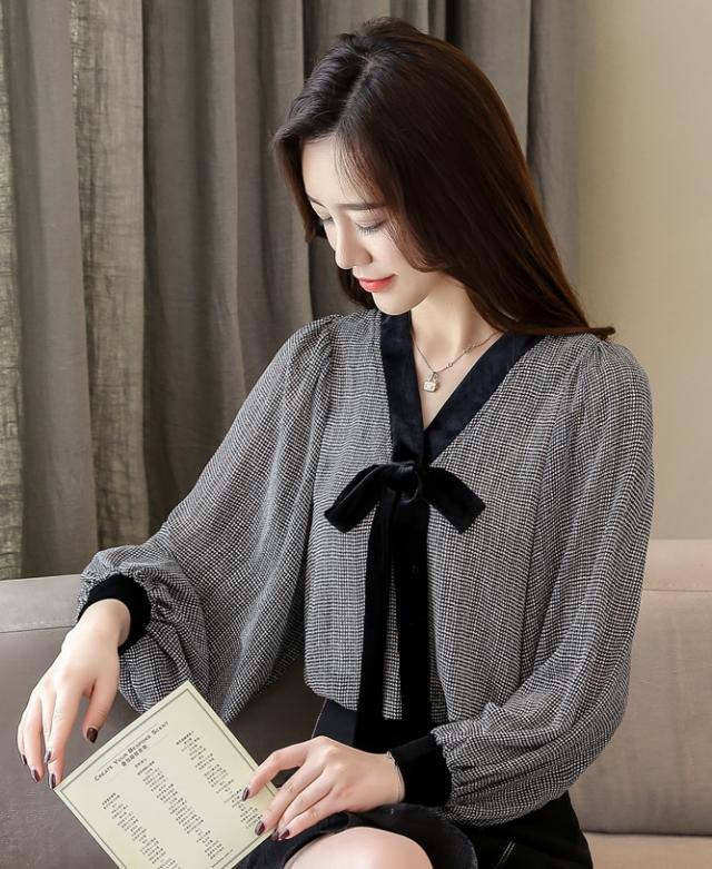 トップス シャツ ミディアム丈 袖あり 長袖 Vネック 襟なし リボン かわいい 大人可愛い きれいめ シンプル 大人 上品 おしゃれ お洒落 レトロ アジアン エスニック エキゾチック 大人女子 ラフ エレガント フォーマル 柄 千鳥格子 春 秋 10代 20代 レディース 女性用 OL 通勤