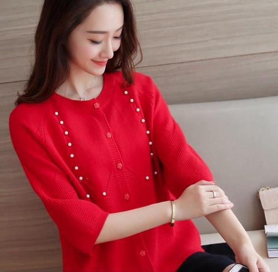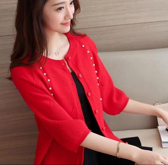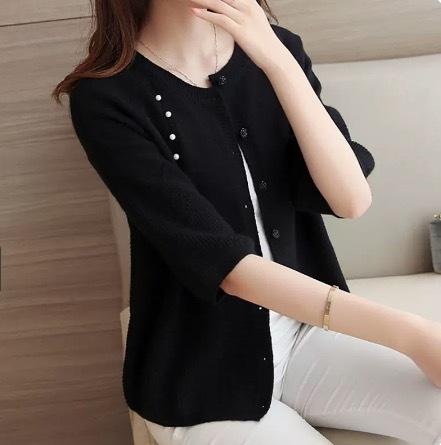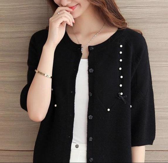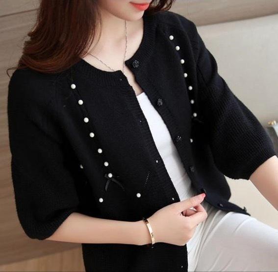 さりげないパールの装飾がフェミニンな七分丈カーディガンです。