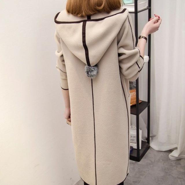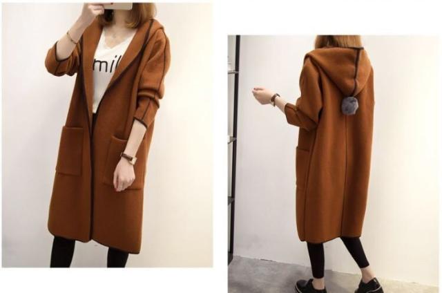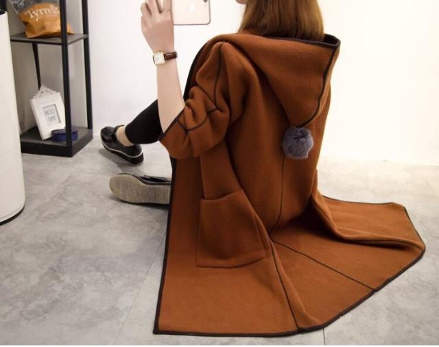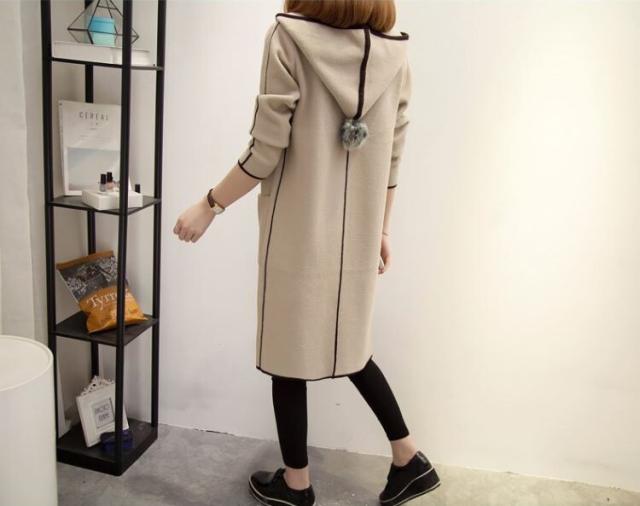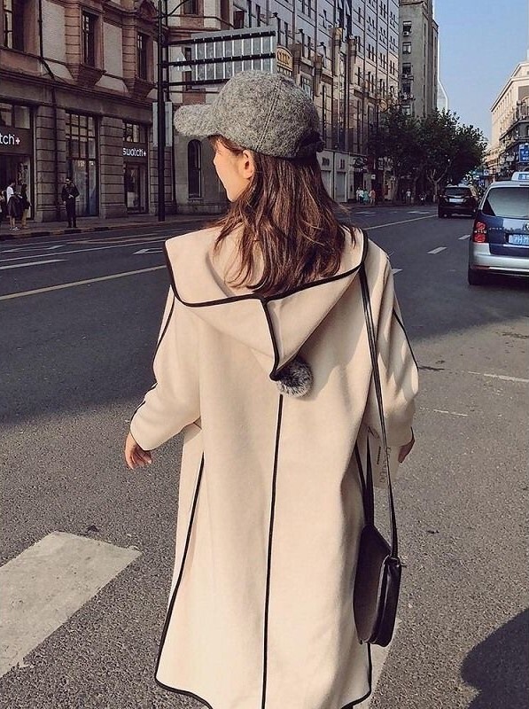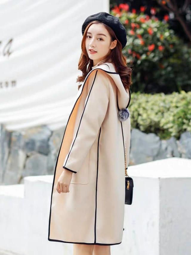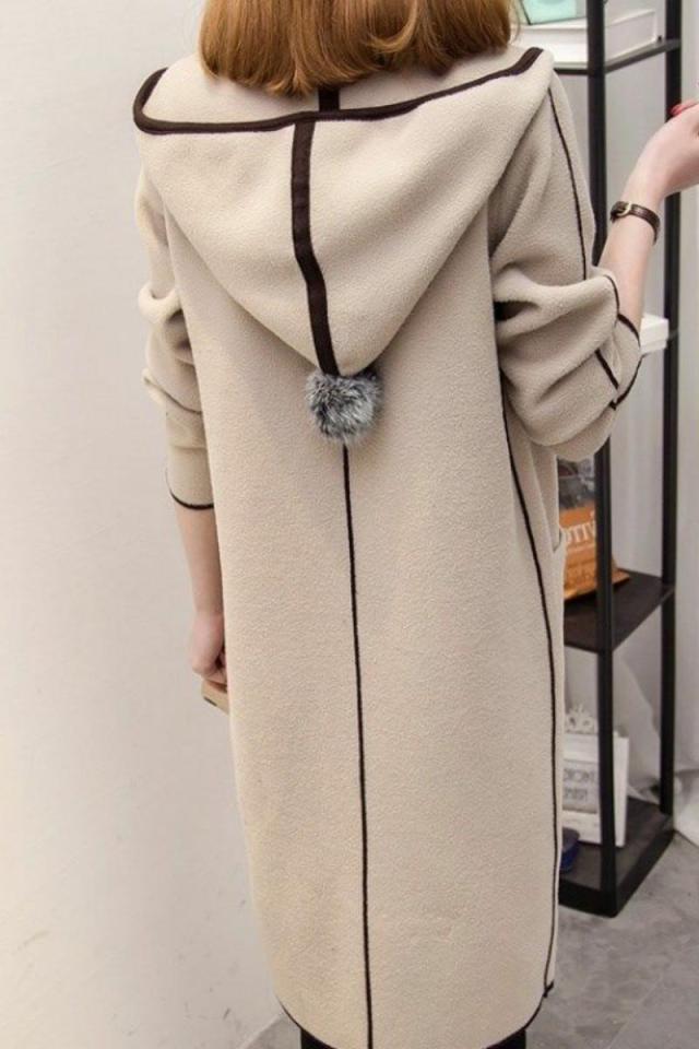 パイピングとフードについたポンポンが目を引くおしゃれなコートです。