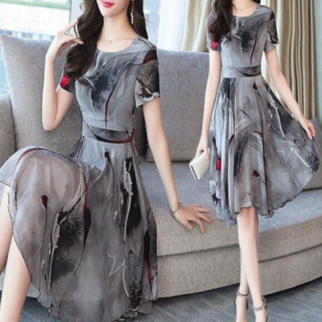 ワンピース ひざ丈 袖あり 半袖 ラウンドネック プリント柄 プリーツ フレア かわいい 大人可愛い きれいめ シンプル カジュアル 大人 上品 おしゃれ お洒落 レトロ 大人女子 こなれ感 春 夏 10代 20代 30代 40代 オフィス ビジネス OL 通勤 デート お出かけ 女子会 パーティー フォーマル 結婚式 パーティー ドレス 着回し 韓国 韓国系 オルチャン ファッション コーデ スタイル モテ 体型カバー トレンド 流行 インスタ映え S M L XL 2XL 3XL 大きいサイズ グレー