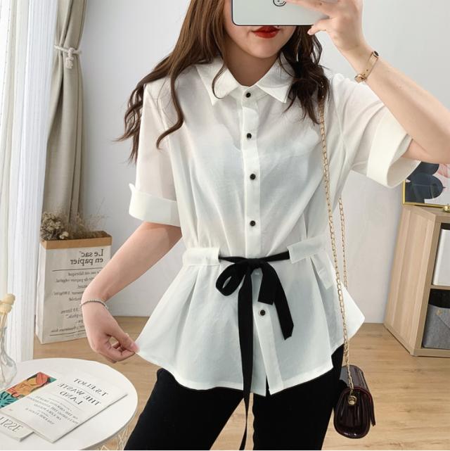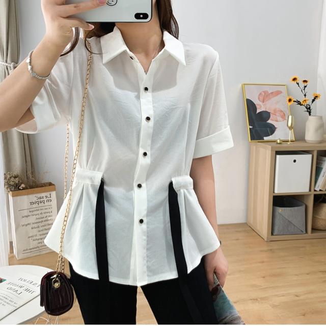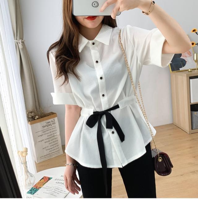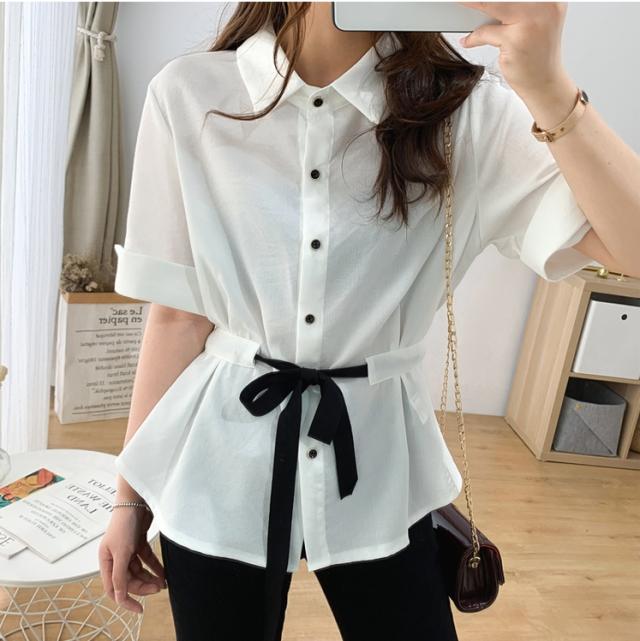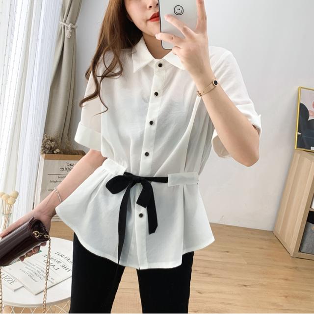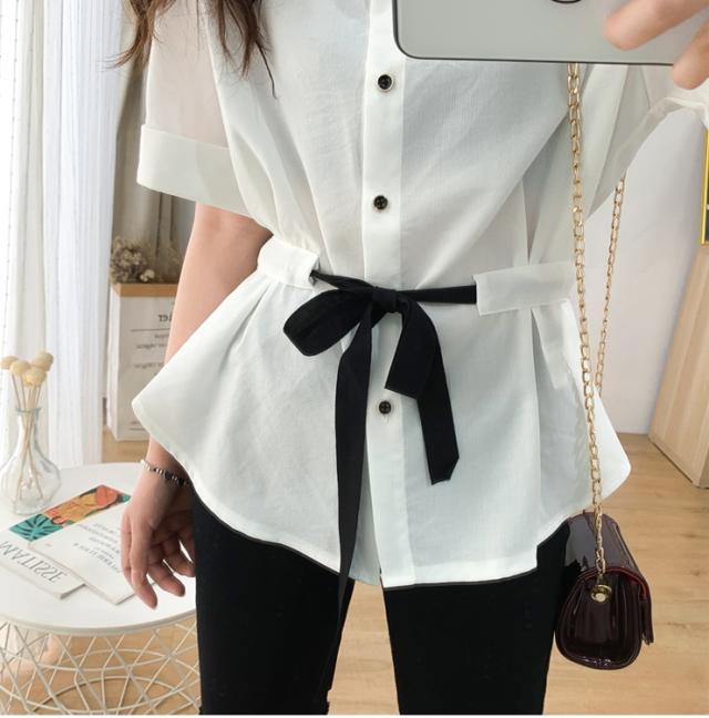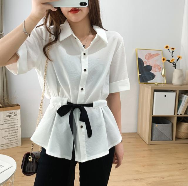 ドロスト ブラウス ペプラム トップス シャツ 袖あり 半袖 5分袖 五分袖 襟付き リボン ウエストリボン 前開き かわいい 大人可愛い きれいめ シンプル カジュアル 大人 上品 おしゃれ お洒落 大人女子 こなれ感 マニッシュ ラブリー キュート クール モード系 エレガント