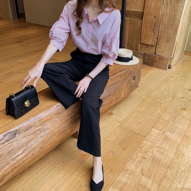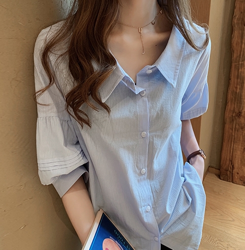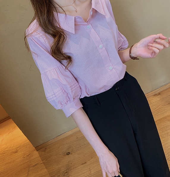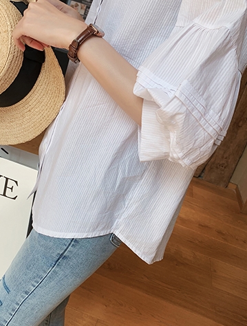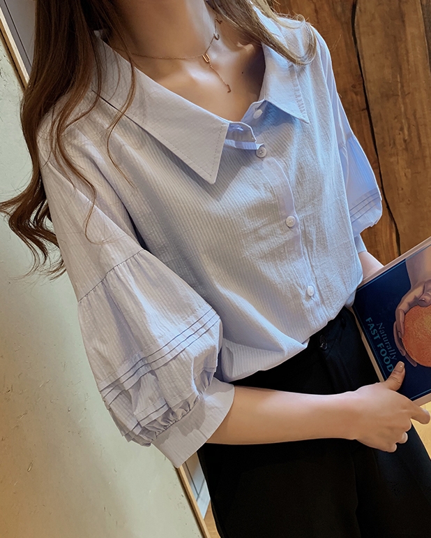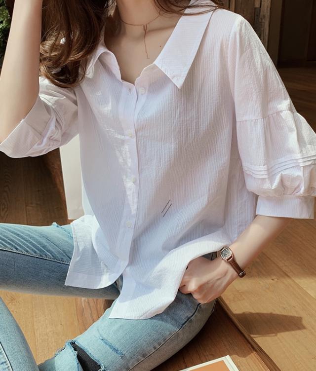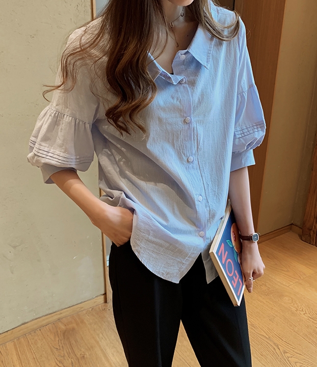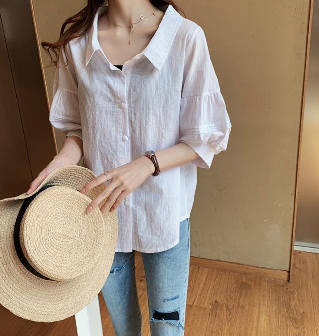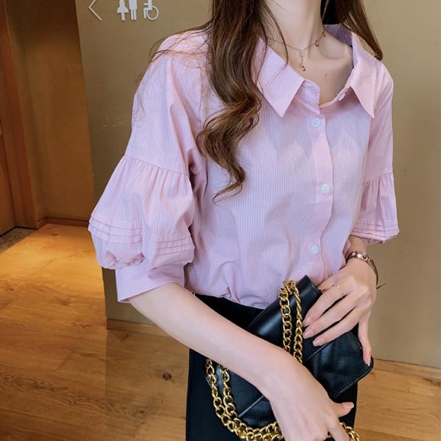 ボリューム袖がおしゃれで可愛い、五分袖シャツ。