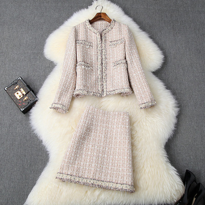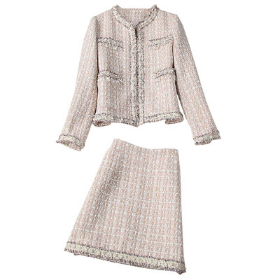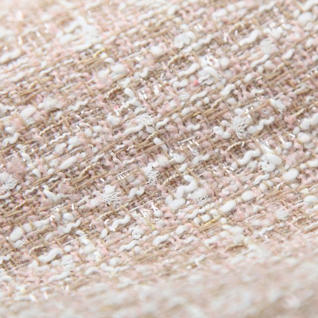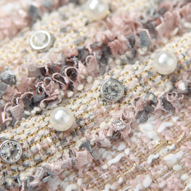 ジャケットには飾りポケットが付いているのがポイント。ジャケットの生地はツィードを使用し、クールでモード感のある表情をプラス。スカートは、ミニ丈で、台形スカート。ノーカラーが女性らしい雰囲気を演出してくれます。