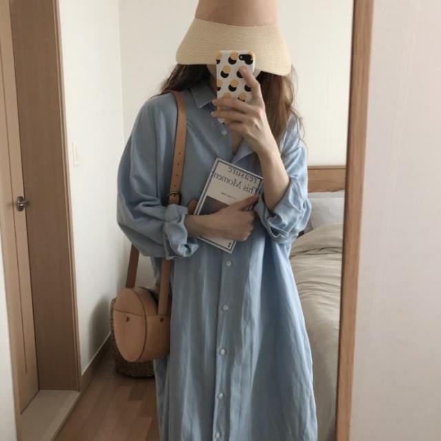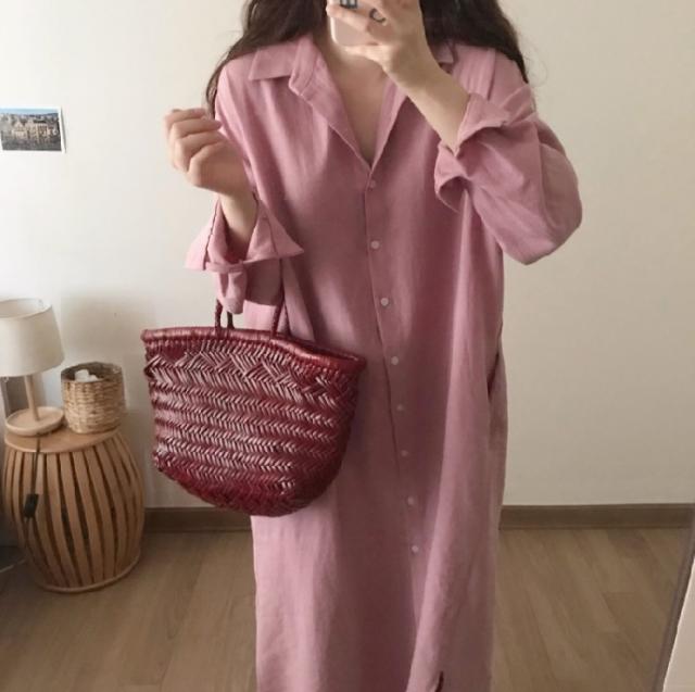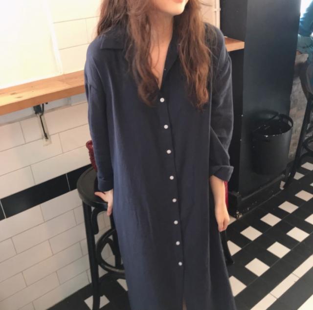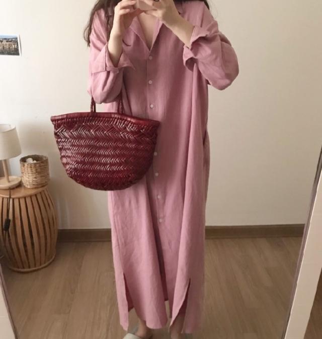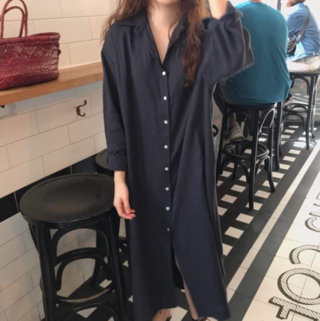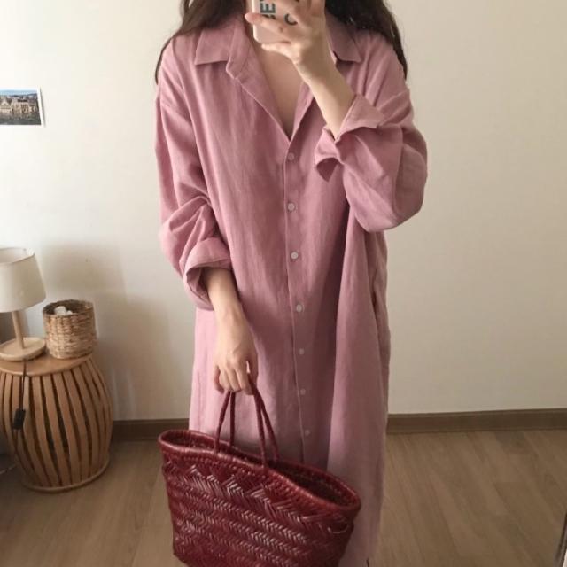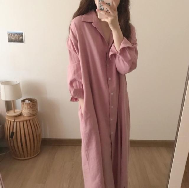 ワンピース シャツワンピース ワンピドレス ロング ロング丈 袖あり 長袖 襟付き ストレート Iライン サイドスリット 前開き 綿 かわいい 大人可愛い シンプル おしゃれ レトロ アジアン エスニック エキゾチック ラフ ルーズ 無地 春 秋 20代 30代 レディース 女性用 通勤