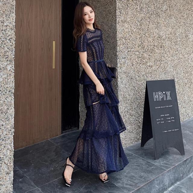 総レース ティアード ワンピース 半袖 ドレス パーティードレス パーティドレス 結婚式ドレス 結婚式のドレス ロングドレス キャバ ワンピ キャバ嬢ドレス ワンピースドレス ロング ロング丈 アンクル丈 袖あり ハイネック 襟なし メロウカラー Aライン レース ウエストマーク