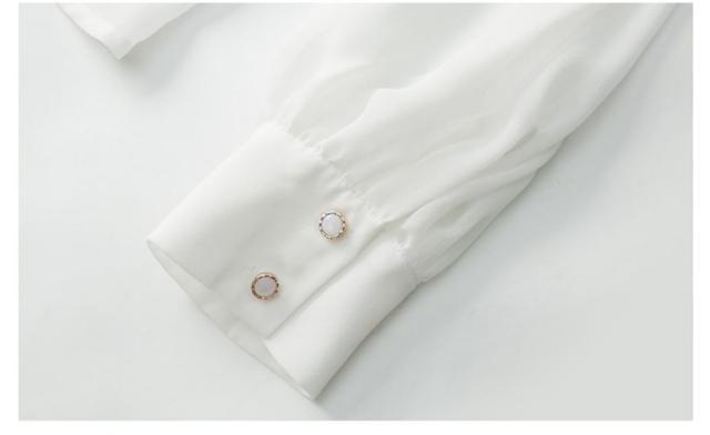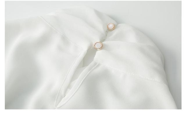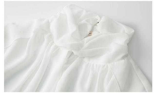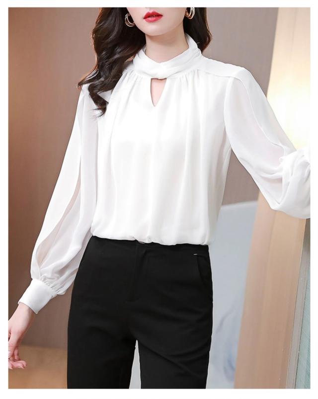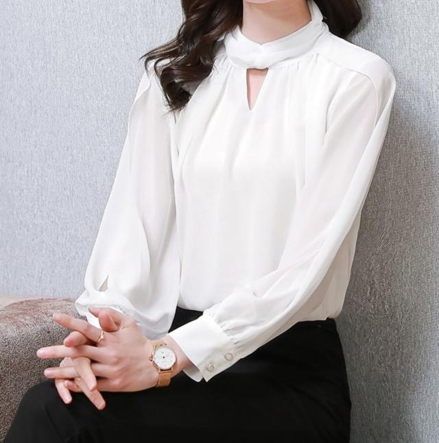 首元のデザインが特徴的なシフォンブラウス。