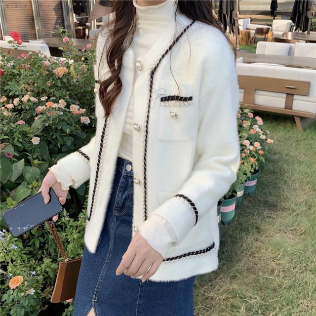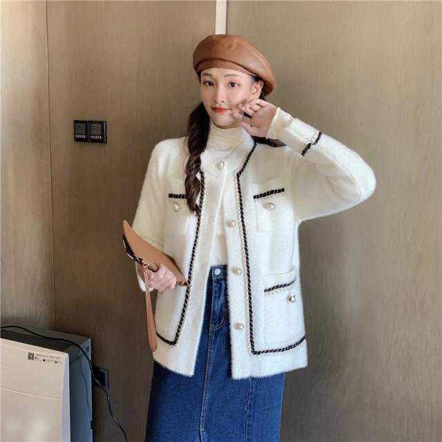 ノーカラー ツイード風 シャギー ジャケット アウター 袖あり 長袖 萌袖 Uネック クルーネック 襟なし もこもこ 前開き パイピング パール かわいい 大人可愛い きれいめ シンプル カジュアル 大人 上品 おしゃれ 大人女子 こなれ感 ラブリー キュート クール モード系