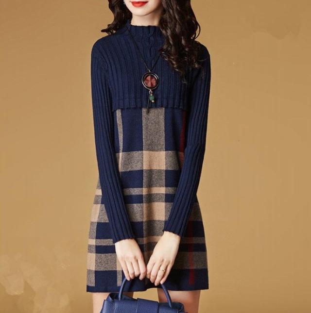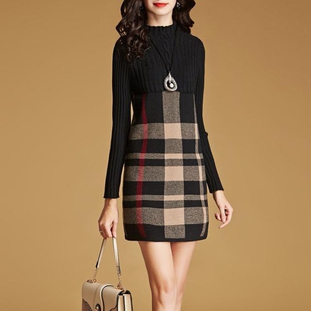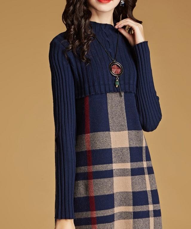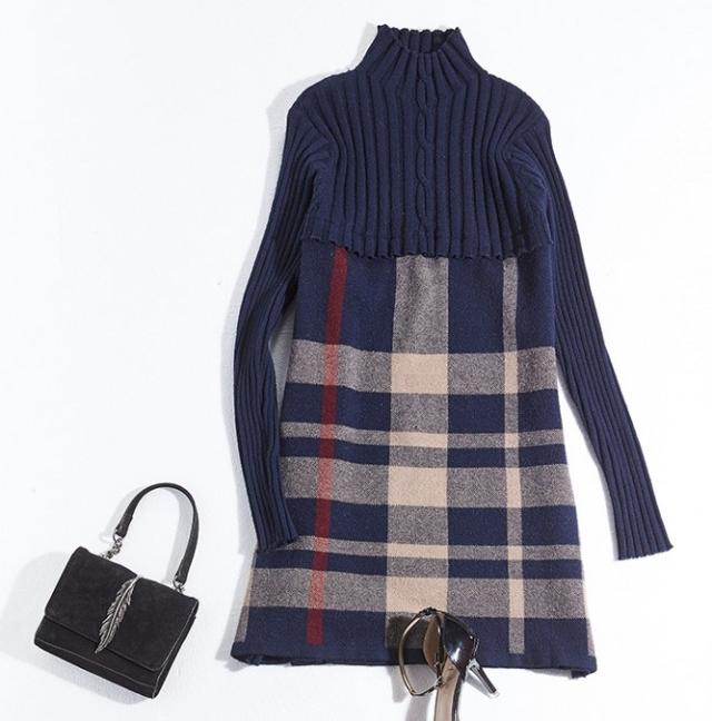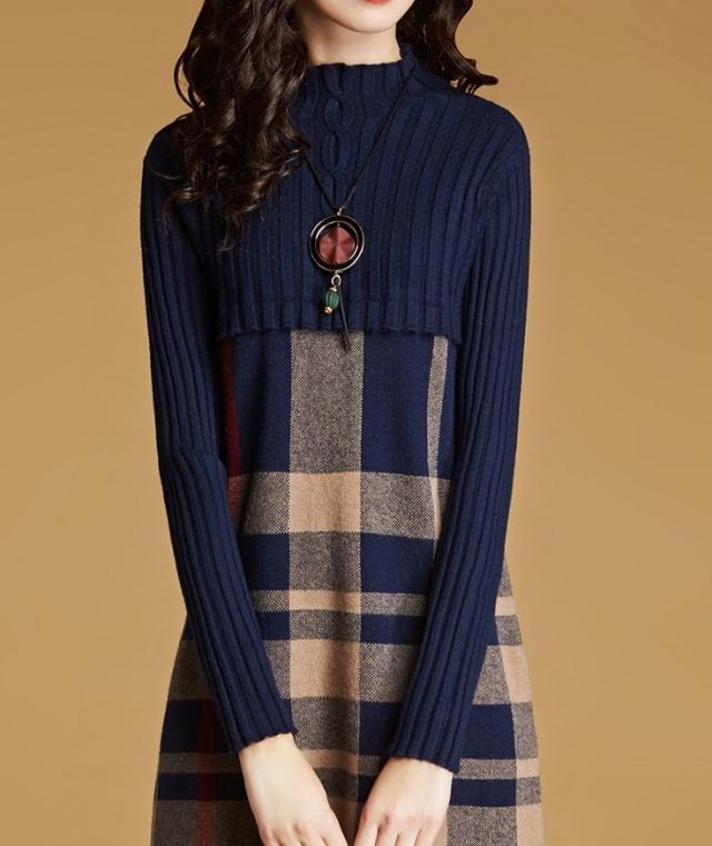 ワンピース ワンピドレス ショート ショート丈 袖あり 長袖 ハイネック 襟なし ストレート Iライン 切り替えデザイン ドッキング ニット 薄手 かわいい 大人可愛い シンプル 上品 おしゃれ アジアン エスニック エキゾチック 存在感 無地 柄 チェック柄 秋 冬 10代 20代