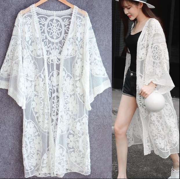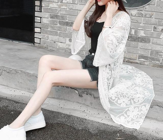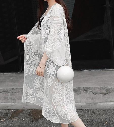 トップス デート レース カーディガン 上着 白トップス ミモレ ミモレ丈 ミディアム丈 袖あり 7分袖 七分袖 長袖 ボリューム袖 フレアスリーブ ホルンスリーブ 襟なし フレア セミフレア 細身 ストレート ワイド Aライン Iライン 切り替えデザイン ドッキング スマート レース
