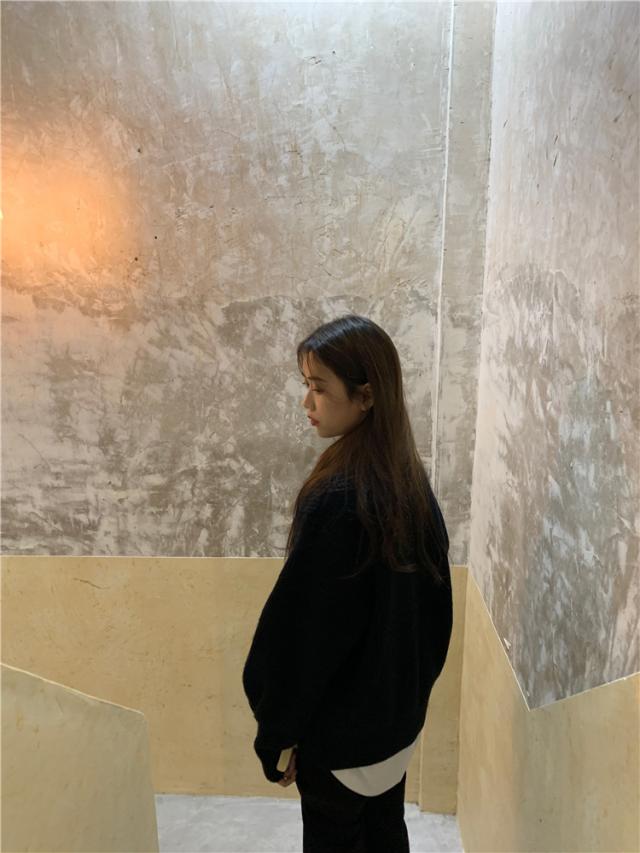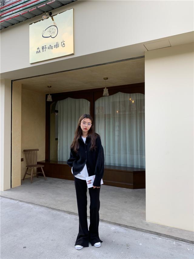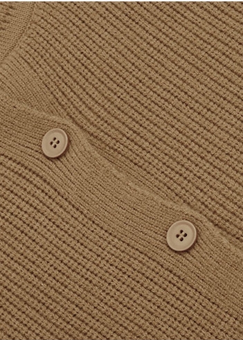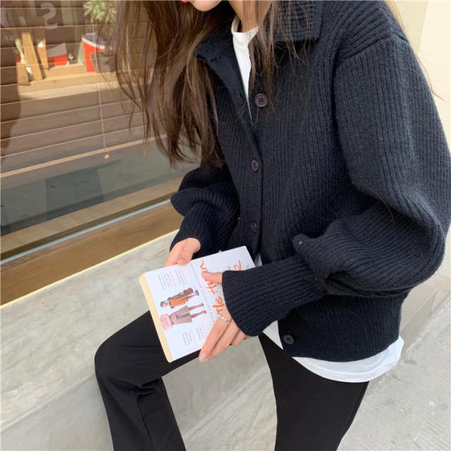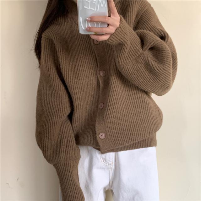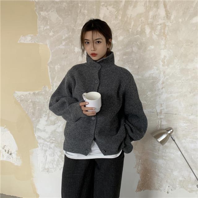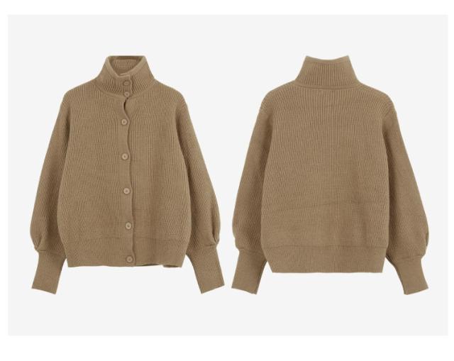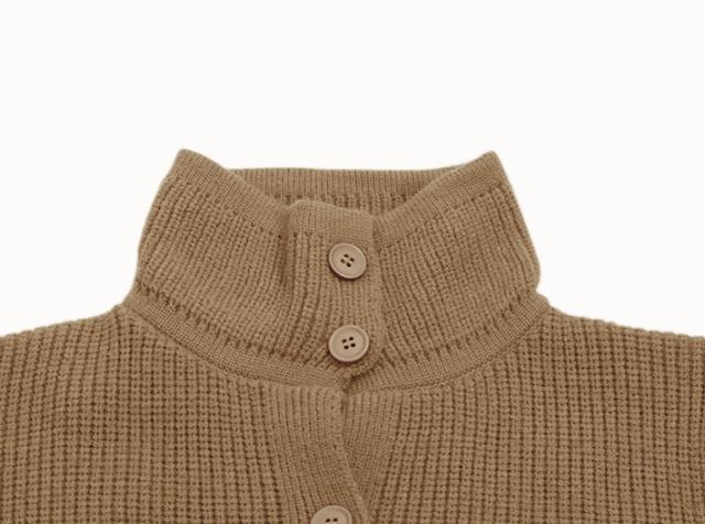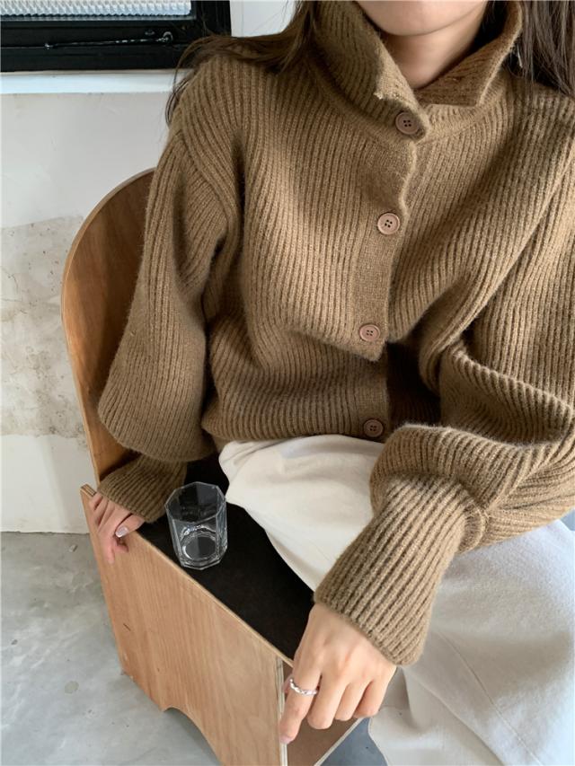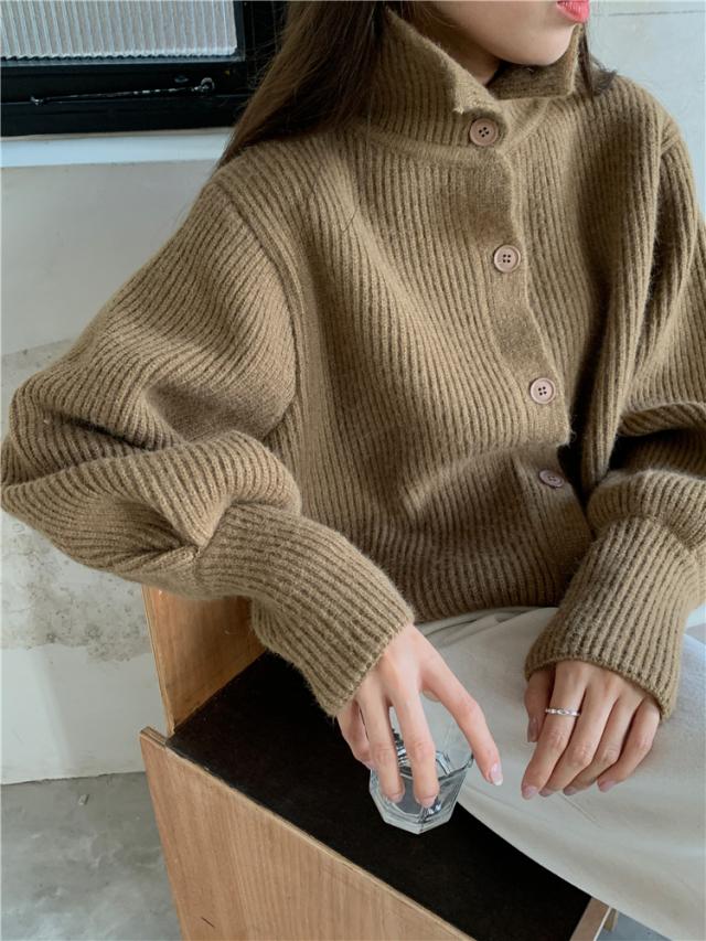カジュアルでラフな雰囲気のハイネックボタンカーディガン。