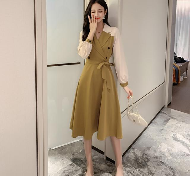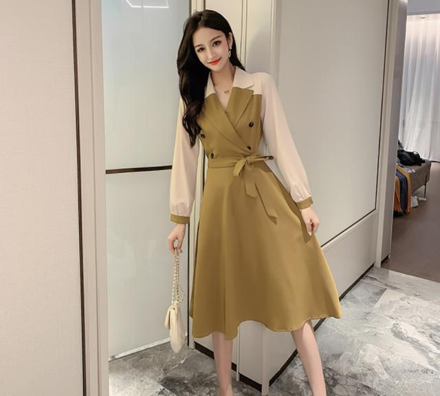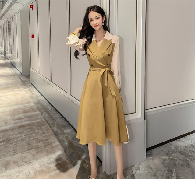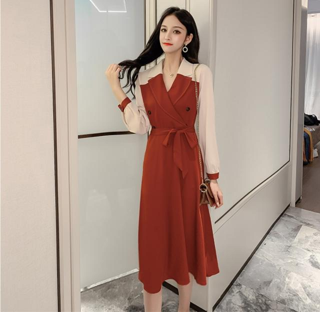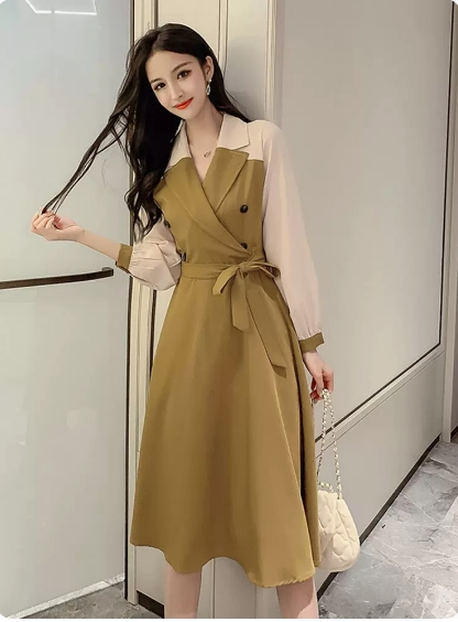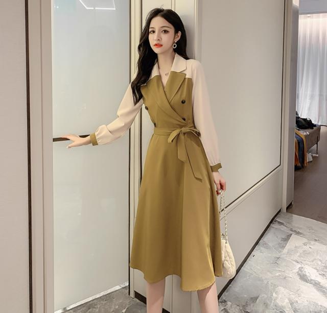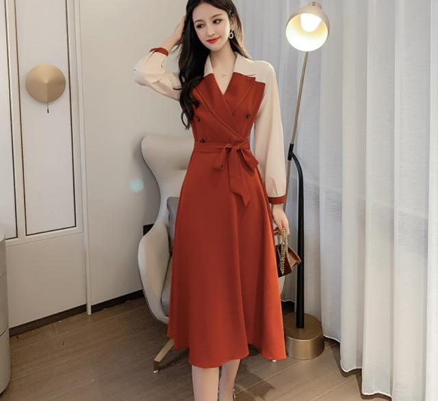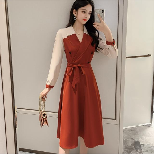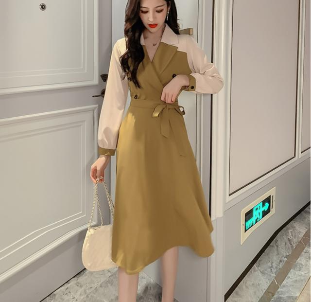 ワンピース トレンチコート コートワンピース 膝下 ミディアム丈 袖あり 長袖 Vネック 襟付き フレア Aライン ウエストマーク ウエストリボン ハイウエスト 大人 上品 おしゃれ お洒落 かっこいい 大人可愛い 大人女子 個性的 エレガント 存在感 バイカラー 春 秋 入学式 入園式 卒業式 卒園式 謝恩会 参観日 オケージョン 20代 30代 40代 ママ OL 通勤 学生 通学 デート お出かけ ホテル レストラン インスタ映え S M L XL 色展開 赤 レッド 黄色 ベージュ 春カラー