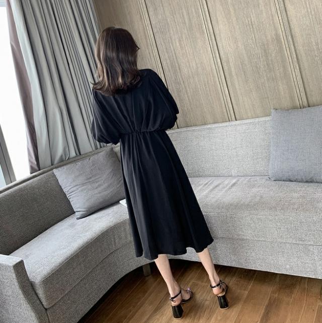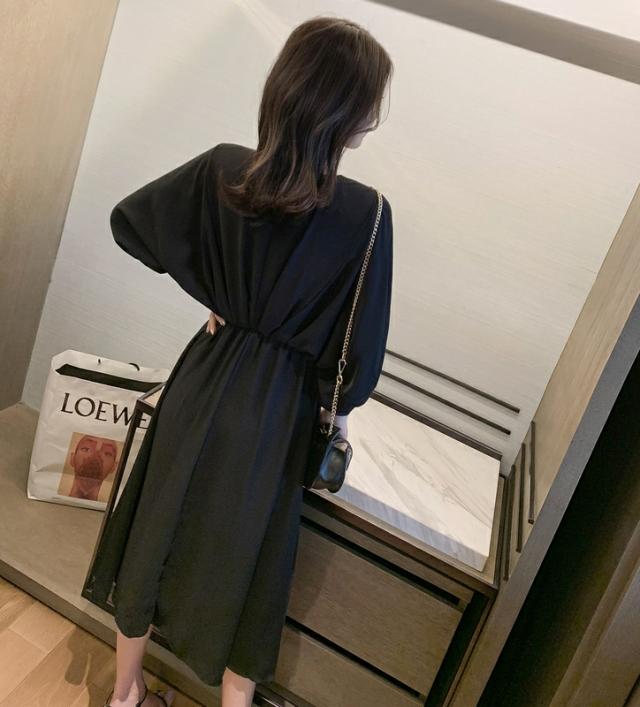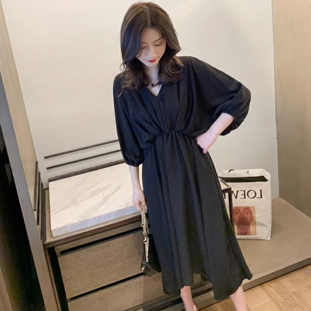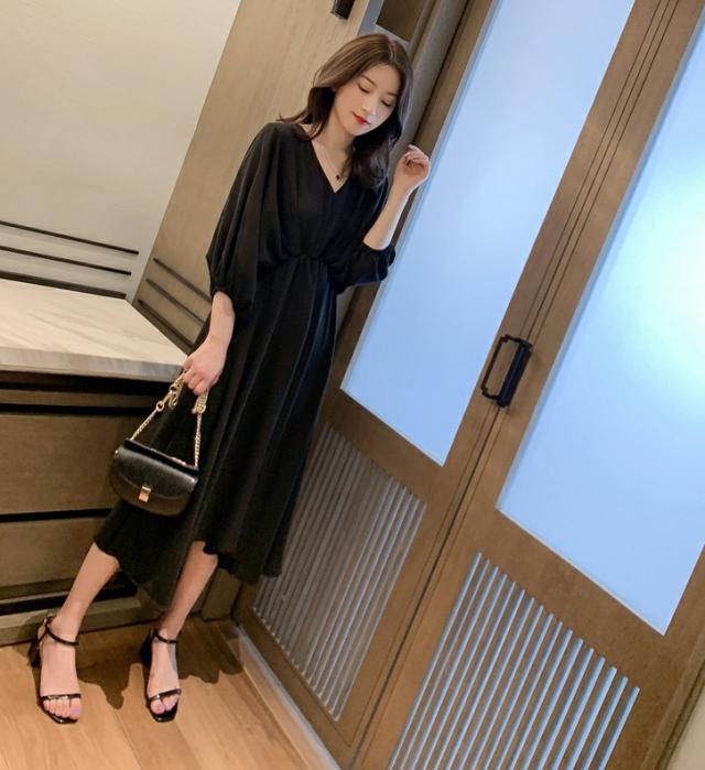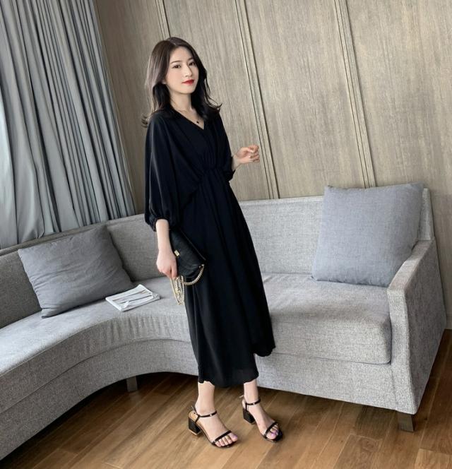 ワンピース ワンピドレス 膝下 ロング ロング丈 袖あり 5分袖 五分袖 ドルマンスリーブ Vネック 襟なし セミフレア Aライン ハイウエスト かわいい 大人可愛い きれいめ シンプル カジュアル 上品 おしゃれ アジアン エスニック エキゾチック セクシー エレガント 無地 夏 秋