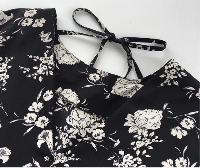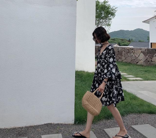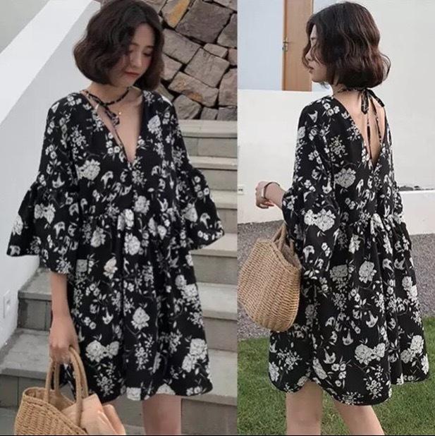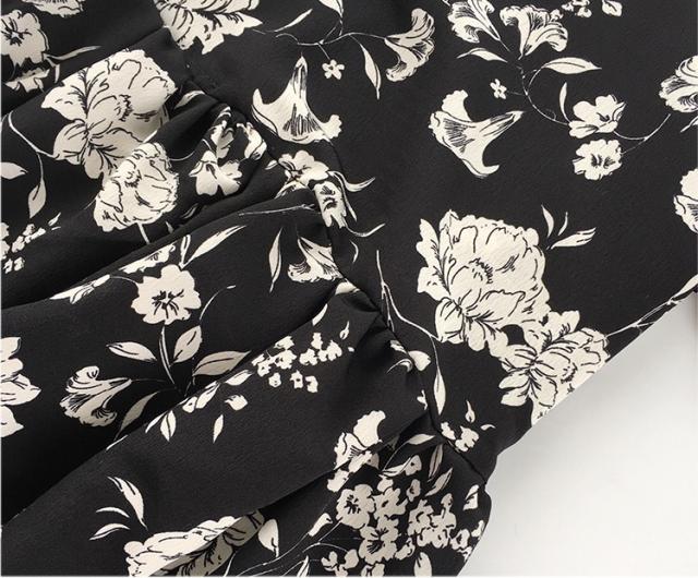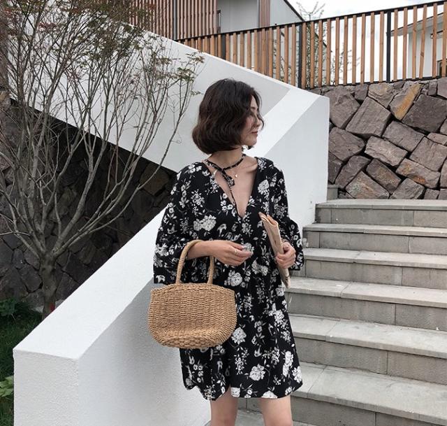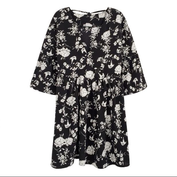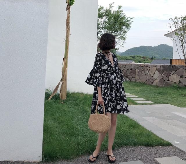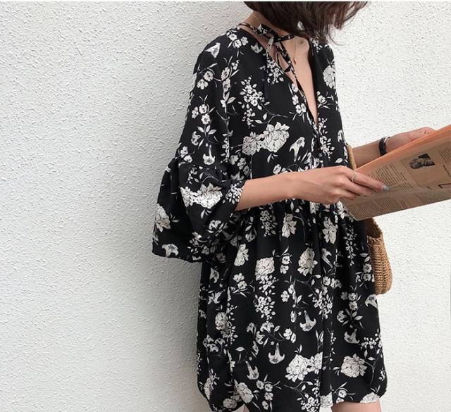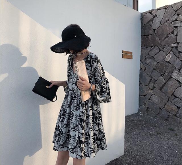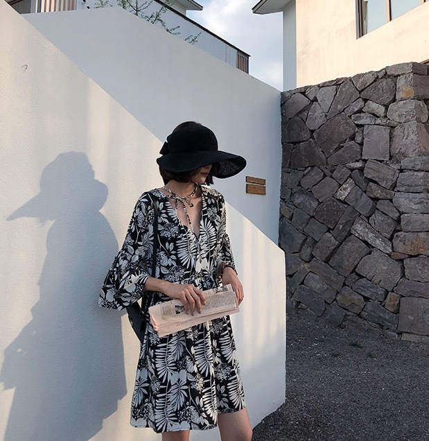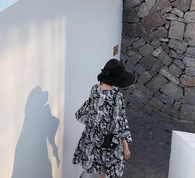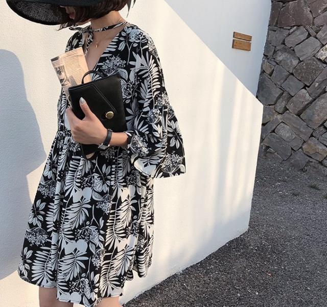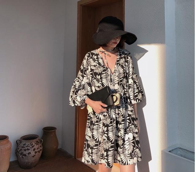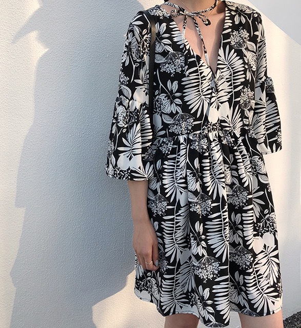 シックなボタニカル柄のミニ丈ワンピースです。
