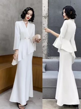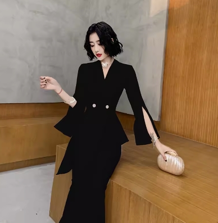 このワンピースドレスはモダンで上品なデザインが特徴です。Vネックとウエスト絞りが女性らしさを引き立て、細身のシルエットがスタイルを美しく魅せてくれます。胸元の谷間魅せデザインとセクシーなスリットが大人の魅力を引き出し、華やかな雰囲気を演出します。