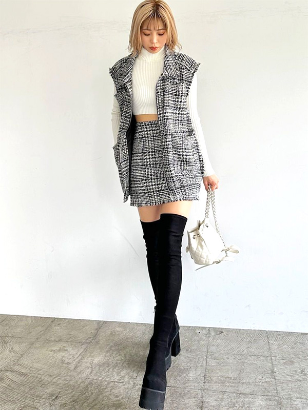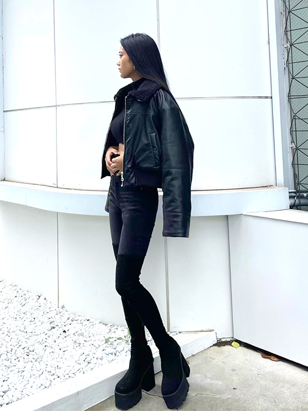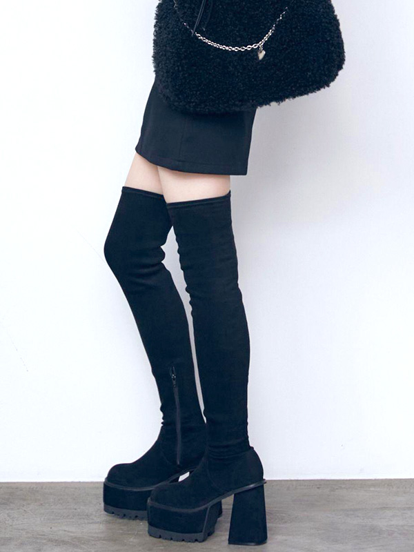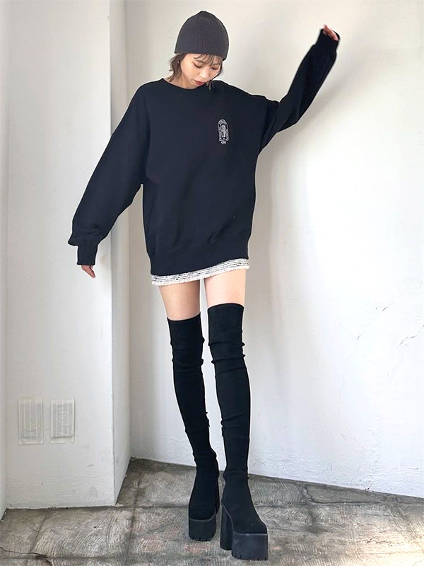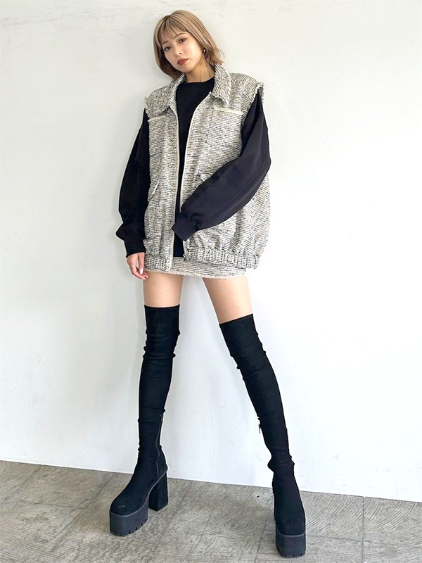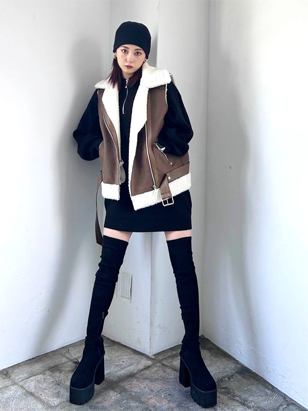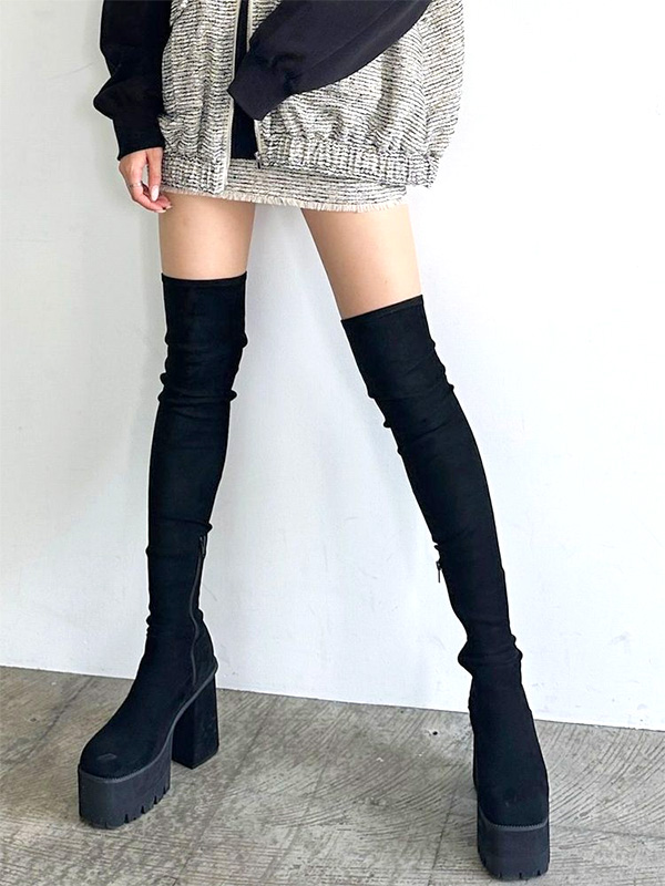 膝上までしっかり包み込むサイハイブーツは、どんなスタイリングでも脚長効果抜群。