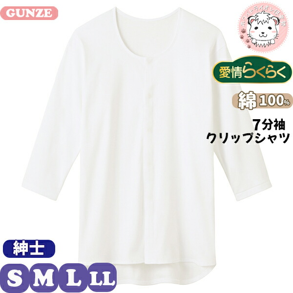 グンゼ 愛情らくらく 7分袖 着がえらくらく 前開き 綿100% S/M/L/LL | クリップ仕様 ゆったり設計 乾燥機対応 洗濯タグなし 無地 メンズ 綿 下着 肌着 インナー HWC118 GUNZE