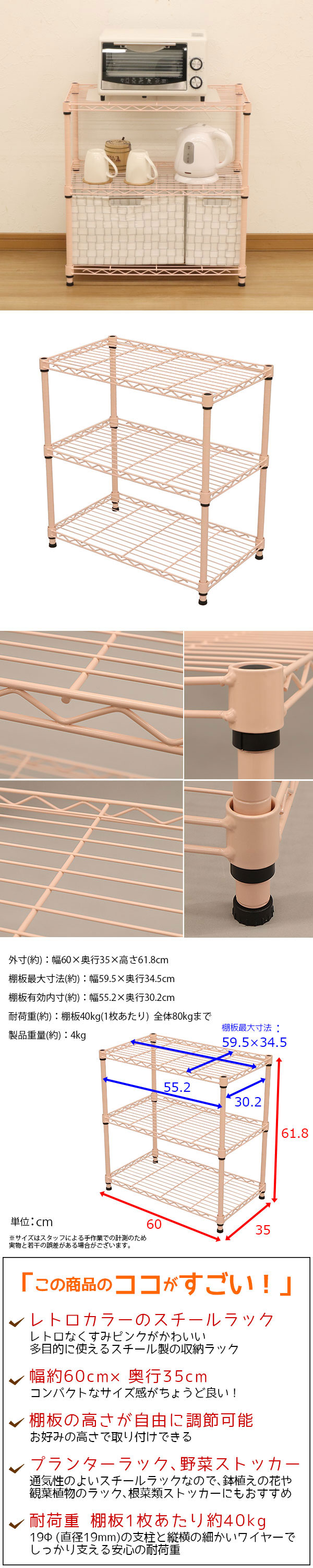 スチールラック3段 幅60cm 奥行35cm 高さ61.8cm くすみピンク 桃色 (奥行き35cm)リビング収納 おもちゃ収納 玄関収納 押し入れ収納 すきま収納 多目的ラック フリーラック シンプル おしゃれ かわいい 可動棚板 移動棚板 アジャスター付き 簡単組立(NS-6035)