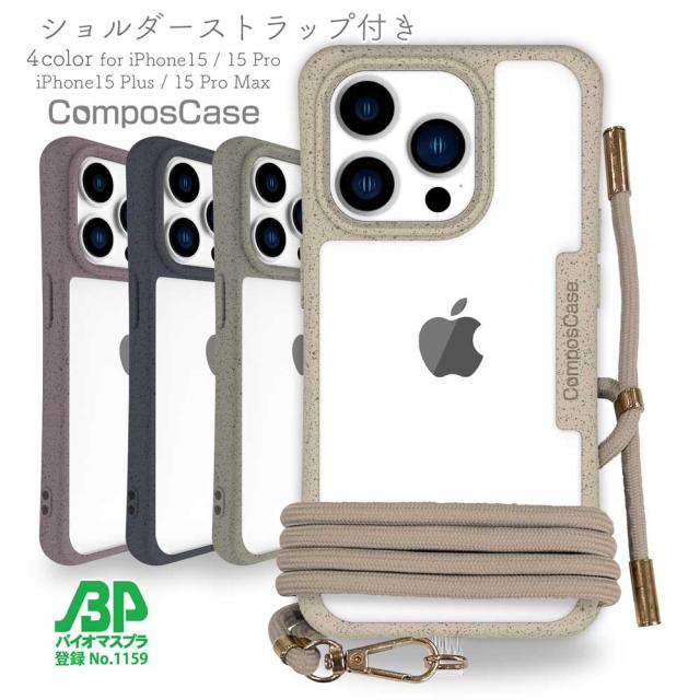 【14時までの注文で当日発送】 コンポスケース iPhone15 / iPhone15 Pro スマホショルダー スマホケース アイフォン ケース 着せ替え 肩掛け 首かけ 斜めがけ 背面 シール ショルダーストラップ エコ 4色 ベージュ モスグリーン グレー パープル