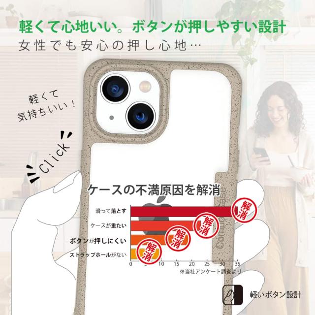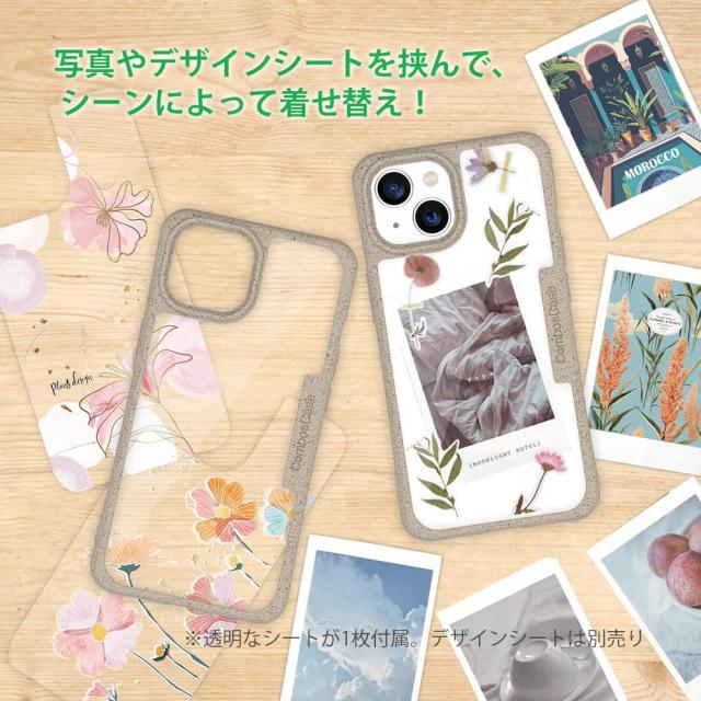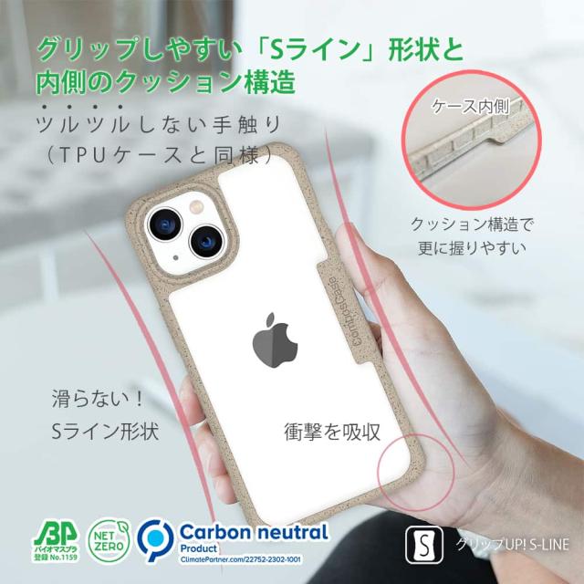 | ケースについて | 背面の内側に入れ込むデザインシートで、シーンに合わせて着せ替え可能。また、グリップしやすいクッション構造で、本体重量は35gと軽減化を実現。さらに衝撃に強いSライン形状、究極に押しやすいボタン設計(切り込みが入ることで押し込む力を軽減)、背面のカメラ・レンズを保護する高さ設計となっております。生分解性プラスチック素材ながらも着脱もしやすく、割れない・指紋防止加工を施しています。 |
