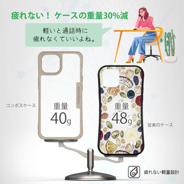 | 商品説明 | コンポスケースは、環境負荷低減を目的に開発されたスマホケース。従来のスマホケースと比べ、CO2排出量を50%削減できます。しかも、循環型社会に対応した素材を使ったケースです。![]() |