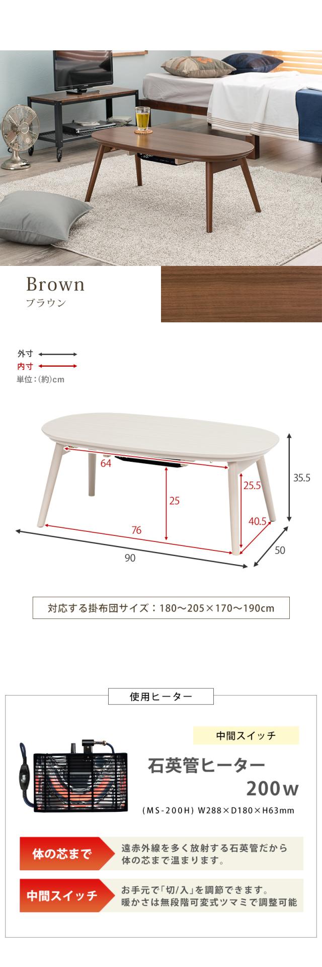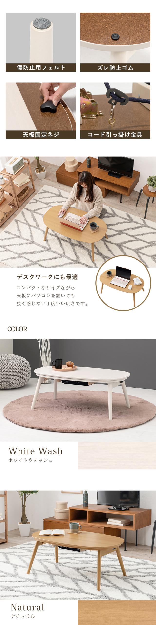 【単品】こたつテーブル 90×50cm 楕円形 ナチュラル 全3色 折れ脚 折りたたみ コンパクトコタツ ちいさめ 木目調 石英管ヒーター CAMINA