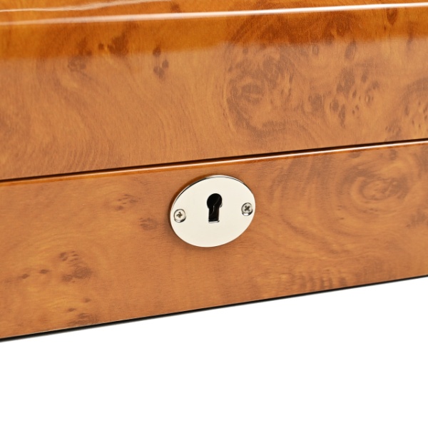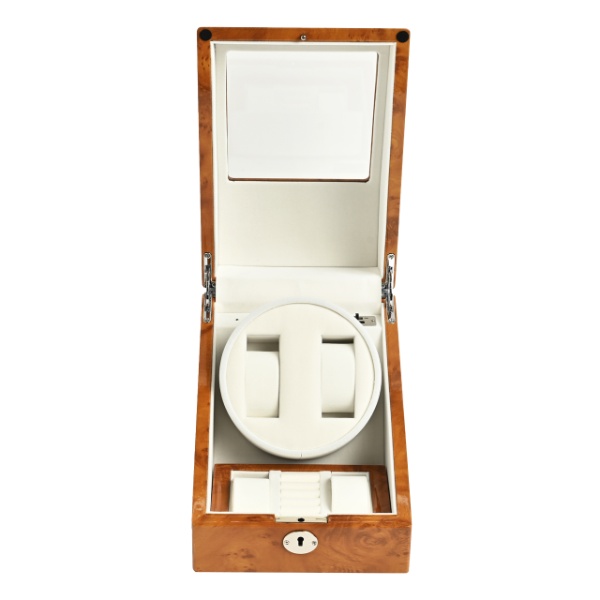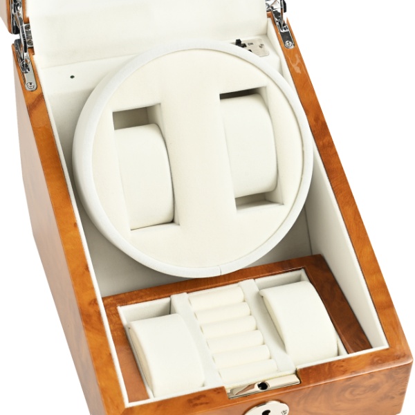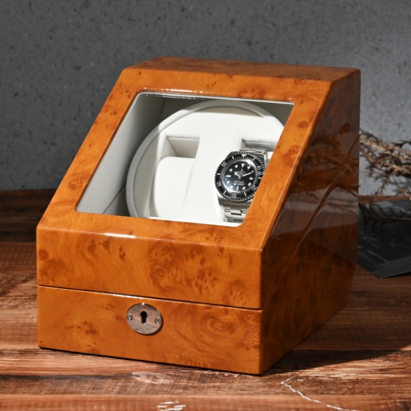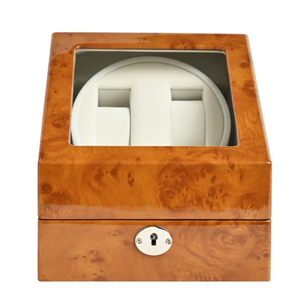 木製2連ワインディングマシーンは、静音性と優れた性能を兼ね備えた優雅なインテリアです。その美しい木製外装は、高品質なピアノブランク仕上げで仕上げられ、上質な雰囲気を醸し出します。透明な窓ガラスが備わっており、内部の腕時計が一目で確認できます。