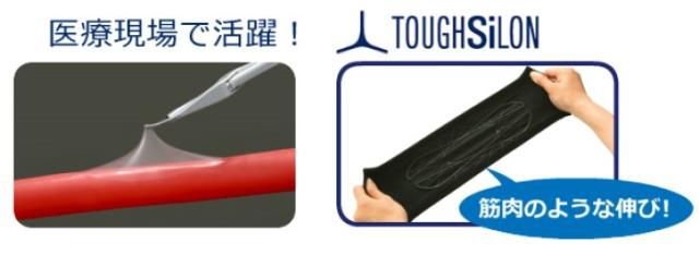 タフシロン?人工筋肉膝サポーターは、臓器シミュレータを製造するタナック社が、人体の物性を再現するために開発した超弾性シリコーン素材「タフシロン(R)」を使用。
