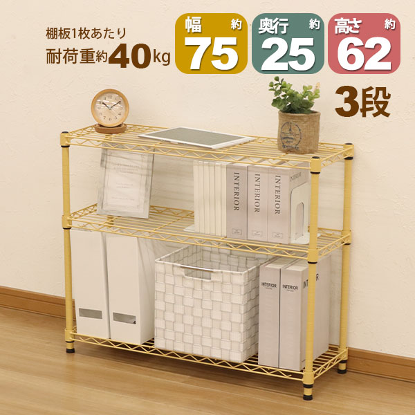 スチールラック3段 幅75cm 奥行25cm 高さ61.8cm くすみイエロー 黄色 スリムタイプ(奥行き25cm)リビング収納 おもちゃ収納 玄関収納 押し入れ収納 すきま収納 多目的ラック フリーラック シンプル おしゃれ かわいい 可動棚板 移動棚板 アジャスター付き 簡単組立(NS-7525)