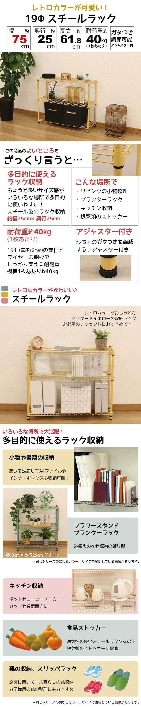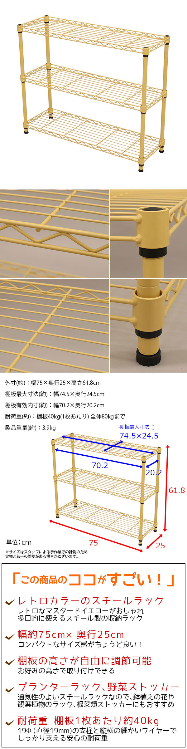 幅約75cm/奥行約25cm/高さ約61.8cm/耐荷重約40kg(1枚あたり)/ガタ付き調節可能アジャスター付