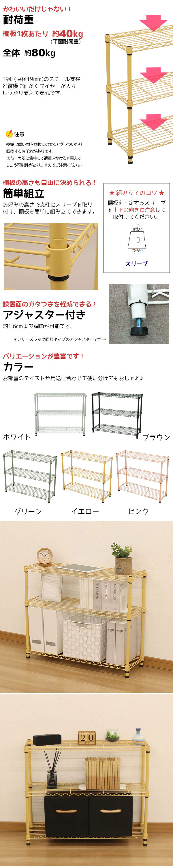 耐荷重(約):棚板40kg(1枚あたり) 全体80kgまで