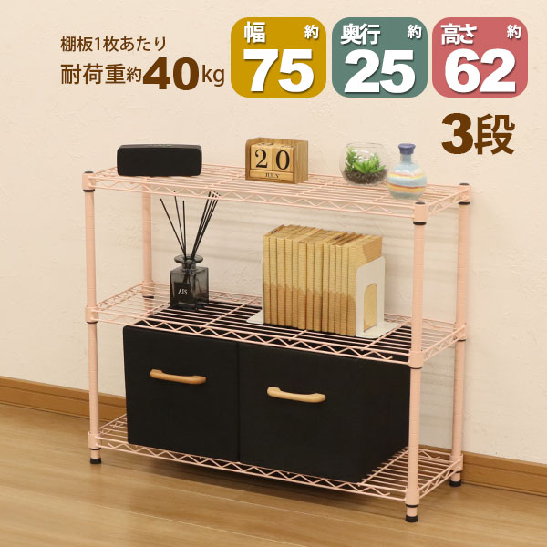 スチールラック3段 幅75cm 奥行25cm 高さ61.8cm くすみピンク 桃色 スリムタイプ(奥行き25cm)リビング収納 おもちゃ収納 玄関収納 押し入れ収納 すきま収納 多目的ラック フリーラック シンプル おしゃれ かわいい 可動棚板 移動棚板 アジャスター付き 簡単組立(NS-7525)