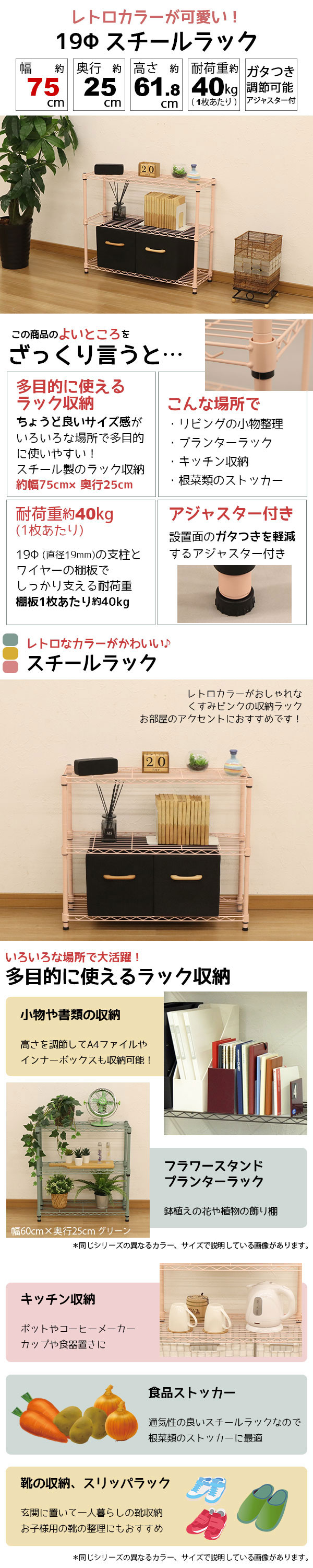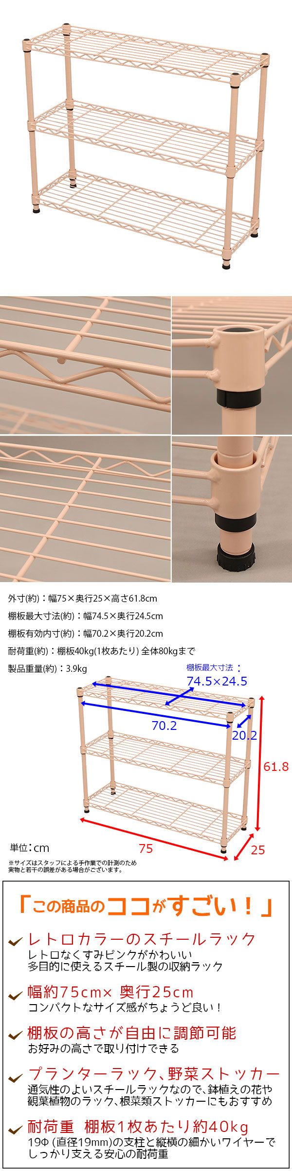 幅約75cm/奥行約25cm/高さ約61.8cm/耐荷重約40kg(1枚あたり)/ガタ付き調節可能アジャスター付