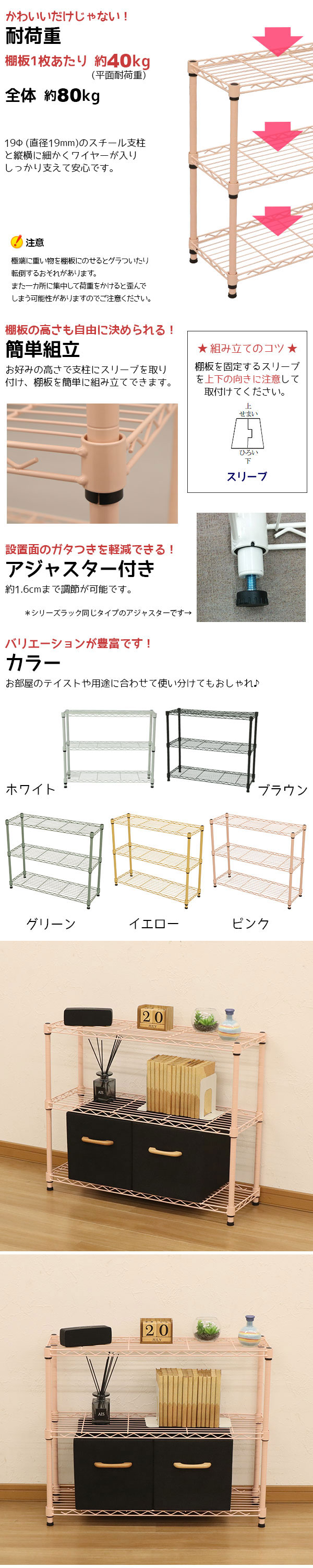 耐荷重(約):棚板40kg(1枚あたり) 全体80kgまで