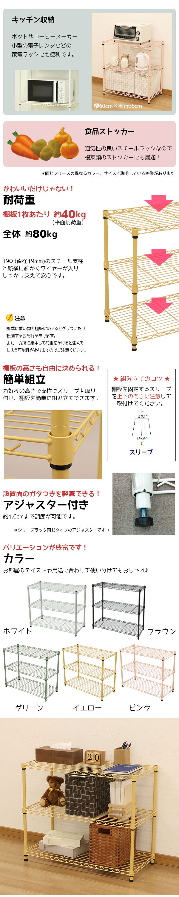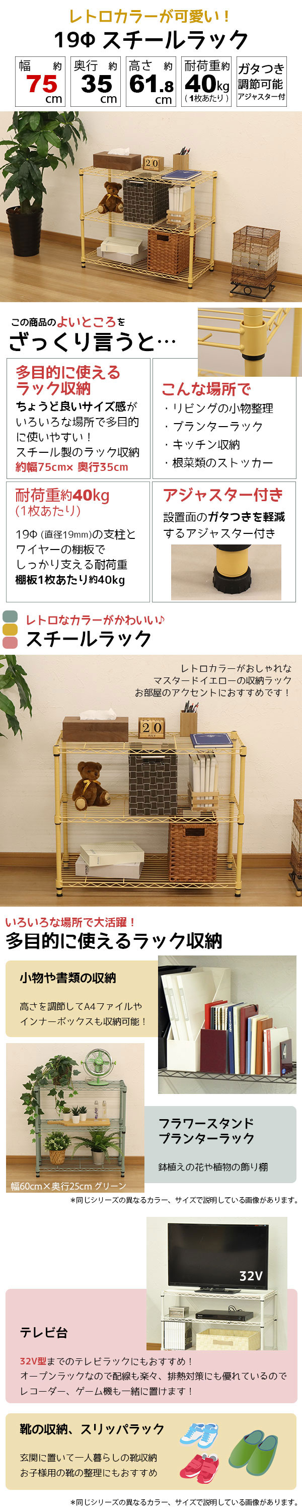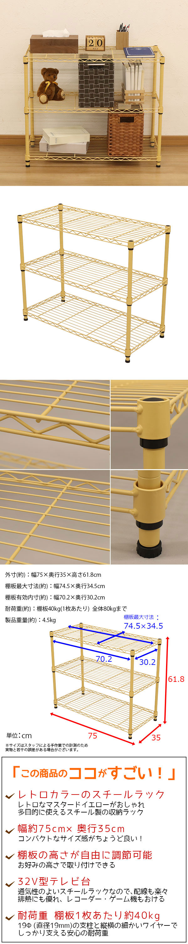 スチールラック3段 幅75cm 奥行35cm 高さ61.8cm くすみイエロー 黄色 (奥行き35cm)リビング収納 おもちゃ収納 玄関収納 押し入れ収納 すきま収納 多目的ラック フリーラック シンプル おしゃれ かわいい 可動棚板 移動棚板 アジャスター付き 簡単組立(NS-7535)