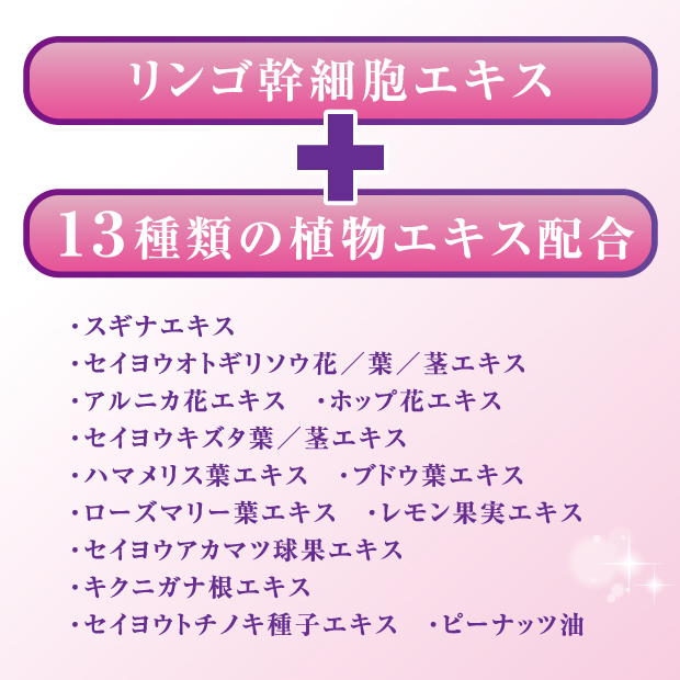 ●リンゴ幹細胞エキス、その他13種類の植物成分配合、プロテオグリカン、ナイアシンアミドの美容保湿成分配合。