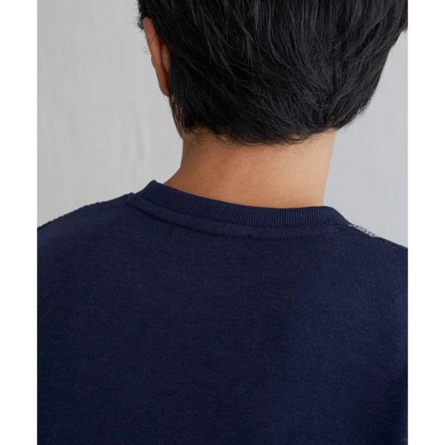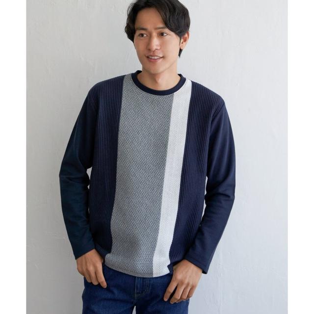 前身頃がパネルボーダーになったプクルーネックプルオーバー。