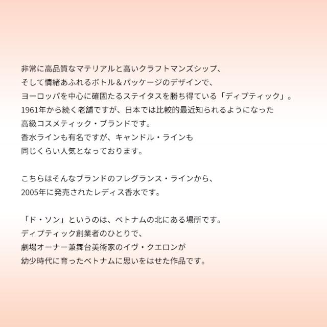 こちらはそんなブランドのフレグランス・ラインから、2005年に発売されたレディス香水です。「ド・ソン」というのは、ベトナムの北にある場所です。ディプティック創業者のひとりで、劇場オーナー兼舞台美術家のイヴ・クエロンが幼少時代に育ったベトナムに思いをはせた作品です。深みのあるオリエンタル・フローラルの香調をベースにしていて、ローズやチュベローズのタイムレスな気品と、スパイシー・スウィートとのゴージャスな饗宴に仕上げられております。