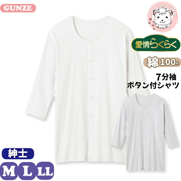グンゼ 愛情らくらく 7分袖 ボタン付き シャツ 前あき 綿100% 保湿 抗菌防臭 M/L/LL | 脇縫いなし 洗濯タグなし 無地 メンズ シニア 介護 綿 下着 肌着 インナー HWB218 GUNZE